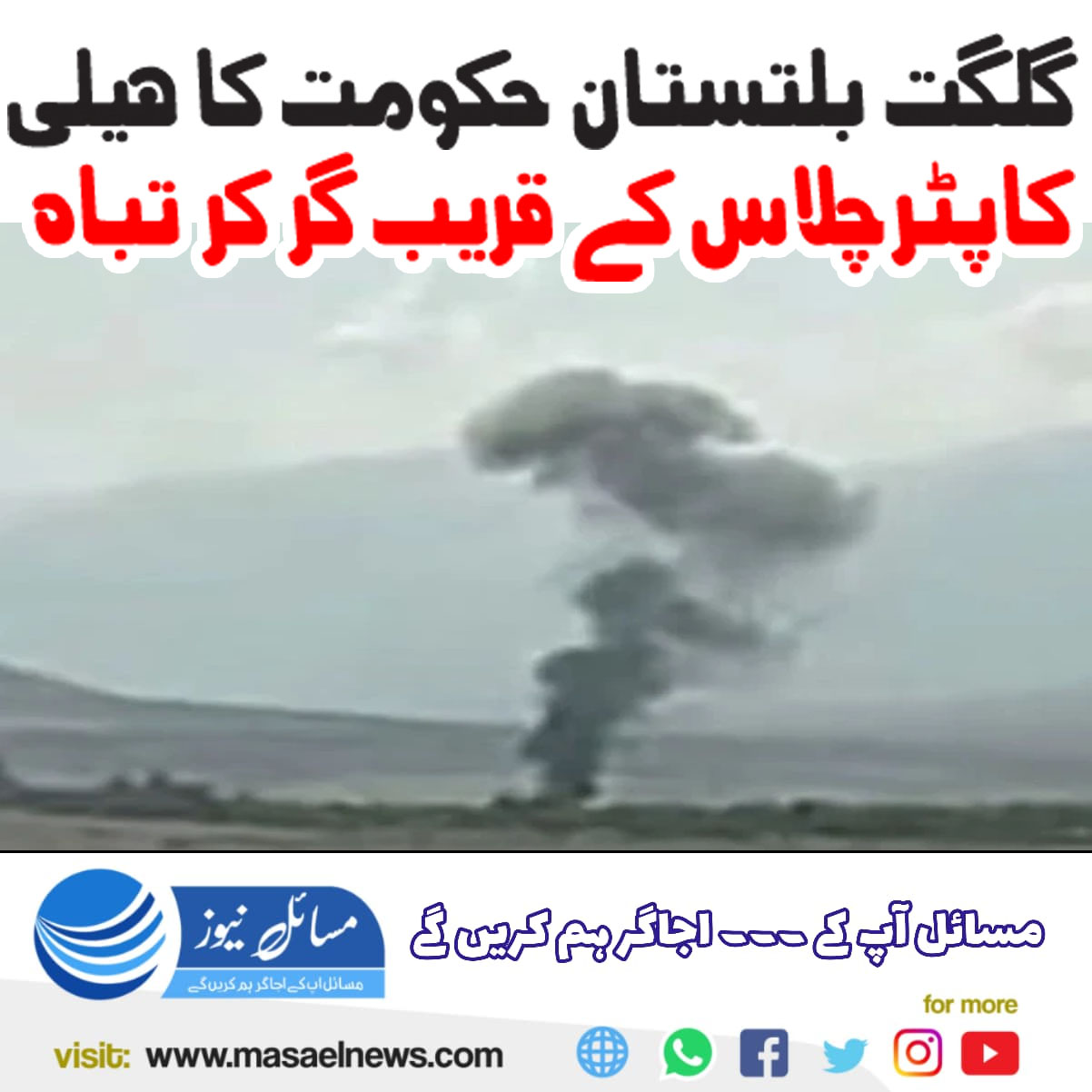 ترجمان حکومت گلگت بلتستان فیض اللہ فراق کے مطابق ہمارا ایک ہیلی کاپٹر چلاس تھور کے مقام پر کریش ہوگیا ہے، ہیلی کاپٹر فنی خرابی کے باعث لینڈ کرنے کے بعد پھر کریش کر گیا۔