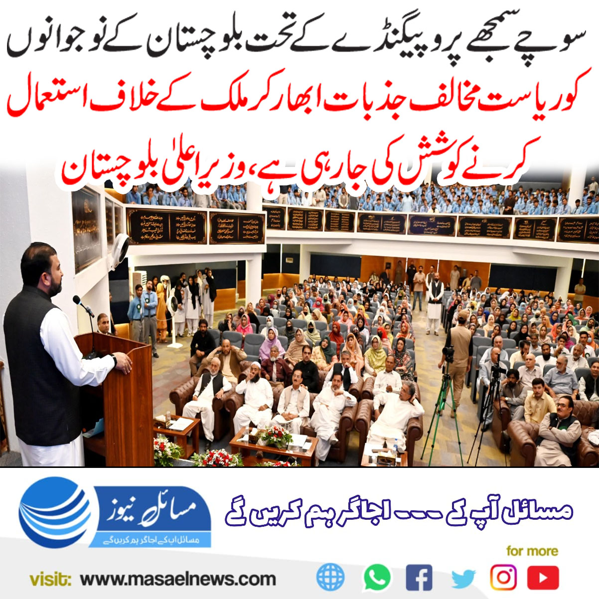 اور انہیں ہر قسم کی بے راہ روی سے محفوظ رکھیں پیر کو یہاں تعمیر نو پبلک کالج کوئٹہ میں اساتذہ اور طلباء سے خطاب کرتے ہوئے وزیر اعلیٰ میر سرفراز بگٹی نے کہا کہ اس ادارے سے اسلام اور پاکستانیت کی خوشبو آتی ہے اور یہاں خاتم النبیین حضرت محمد ﷺ کی تعلیمات کی روشنی میں طلباء کی بہترین ذہن سازی کی جا رہی ہے انہوں نے کہا کہ اساتذہ اللہ تعالیٰ کے منتخب لوگ ہیں جو معاشرے کو علم کے زیور سے آراستہ کرتے ہیں اور نوجوانوں کی کردار سازی میں کلیدی کردار ادا کرتے ہیں وزیر اعلیٰ نے کہا کہ ایک سوچے سمجھے پروپیگنڈے کے تحت بلوچستان کے نوجوانوں کو ریاست مخالف جذبات ابھار کر ملک کے خلاف استعمال کرنے کی کوشش کی جا رہی ہے، لیکن تاریخ گواہ ہے کہ جس نے اس ملک سے وفا کی اللہ تعالیٰ نے اسے عزت بخشی اور جس نے پاکستان سے بے وفائی کی وہ رسوا ہوا انہوں نے کہا کہ بلوچستان میں سوشل میڈیا کا استعمال اکثر منفی انداز میں کیا جاتا ہے اور بغیر تصدیق کے خبریں آگے بڑھا دی جاتی ہیں،