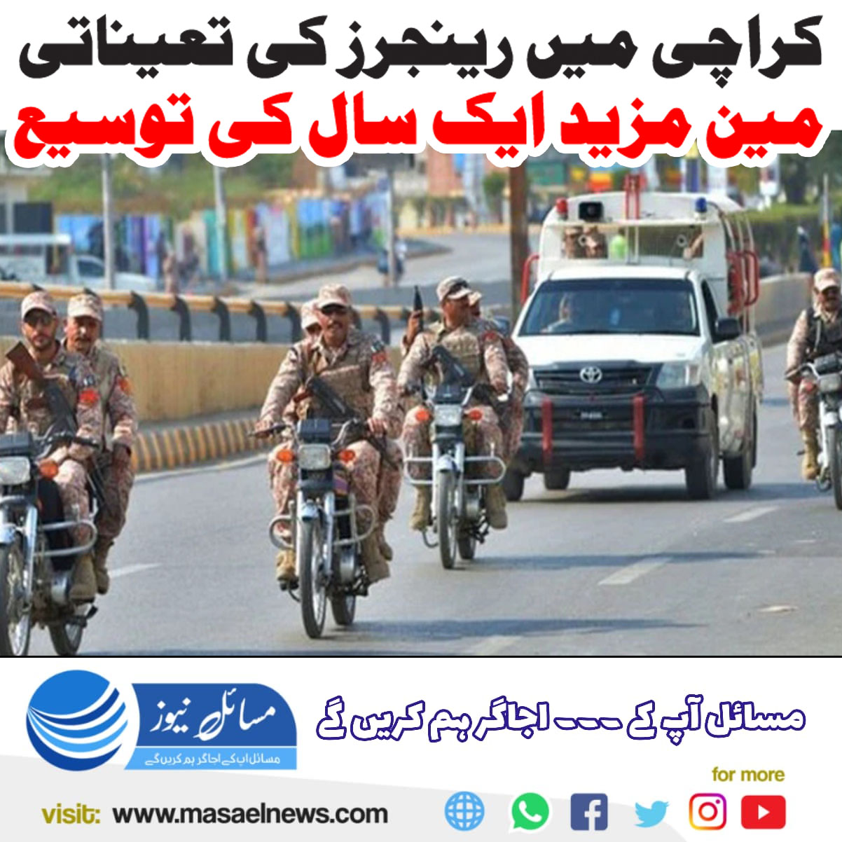کراچی (مسائل نیوز)کراچی میں رینجرز کی تعیناتی میں مزید ایک سال کی توسیع کردی گئی۔