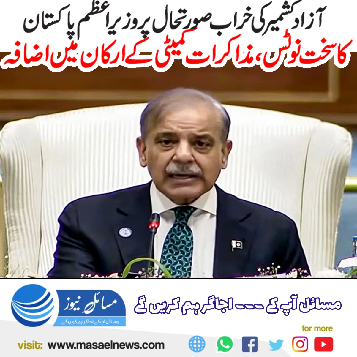 اسلام آباد(مسائل نیوز)وزیر اعظم پاکستان شہباز شریف نے آزاد کشمیر کی صورتحال پر گہری تشویش اور سخت نوٹس لیتے ہوئے شہریوں سے پُر امن رہنے کی زوردار اپیل کی جبکہ مذاکراتی کمیٹی کے ارکان میں اضافہ بھی کر دیا۔
