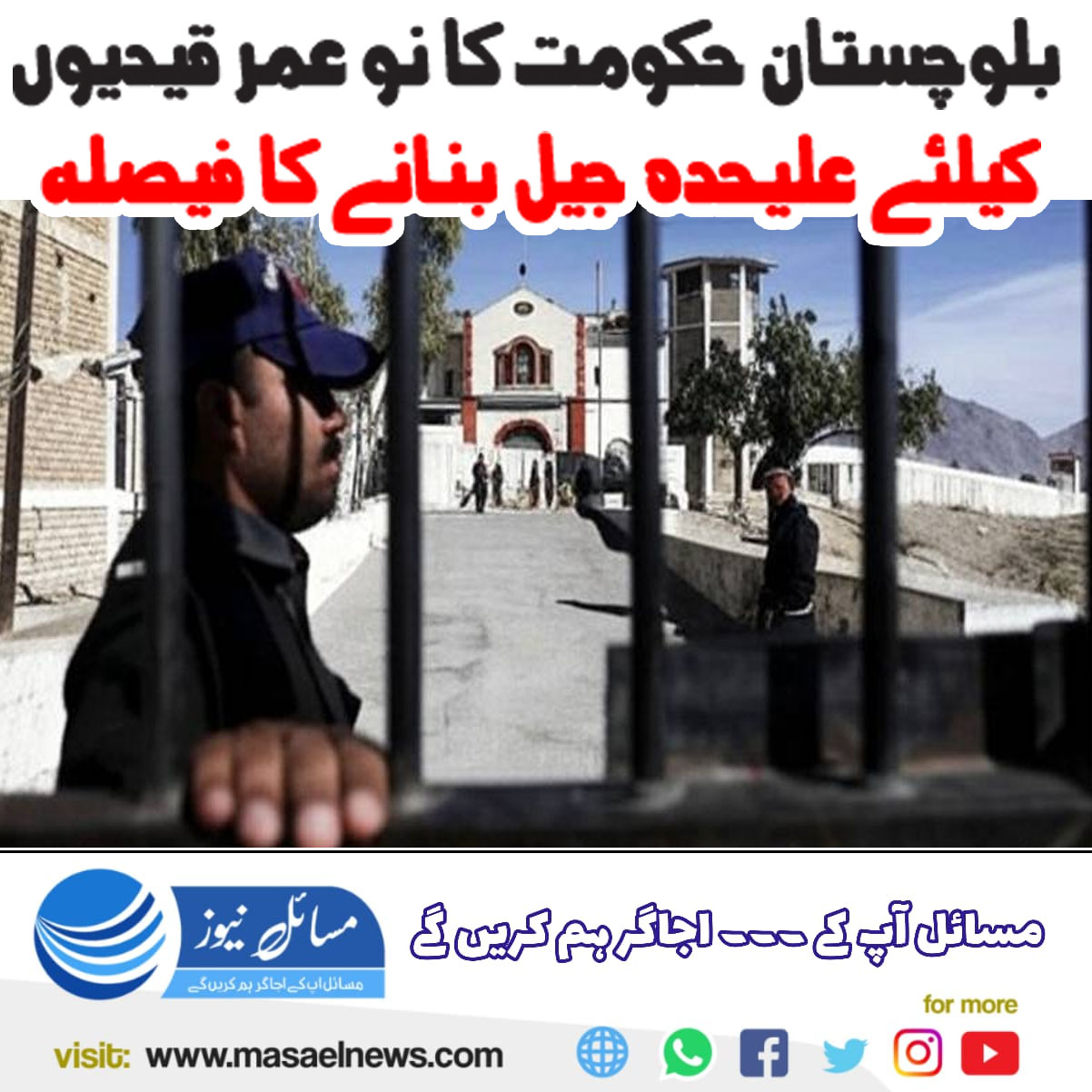 کوئٹہ(مسائل نیوز) بلوچستان حکومت نے نو عمر قیدیوں کے لئے کوئٹہ میں علیحدہ جیل بنانے کا فیصلہ کیا ہے۔