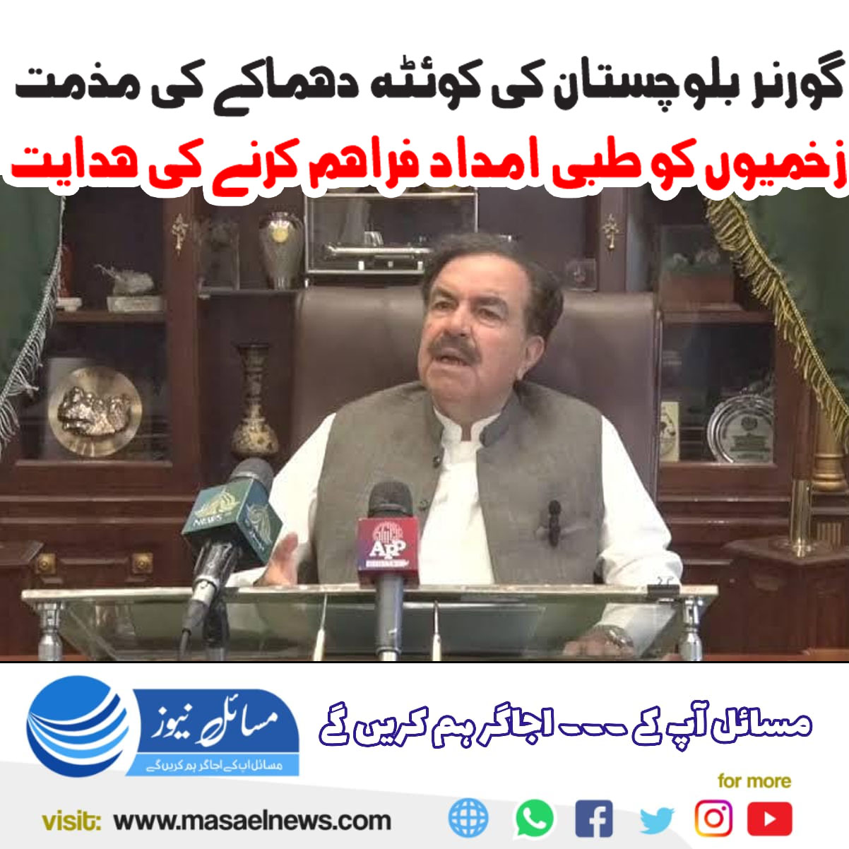 گورنر نے متعلقہ حکام کو ہدایت جاری کی کہ دھماکے میں زخمی ہونے والے افراد کو فوری طور پر بہترین طبی سہولیات فراہم کی جائیں۔ انہوں نے کہا کہ بلوچستان کو ہر قسم کی دہشتگردی سے پاک کرنے اور اسے امن و آشتی کا گہوارہ بنانے کے لیے تمام اسٹیک ہولڈرز کو مشترکہ طور پر مؤثر اقدامات کرنے ہوں گے۔