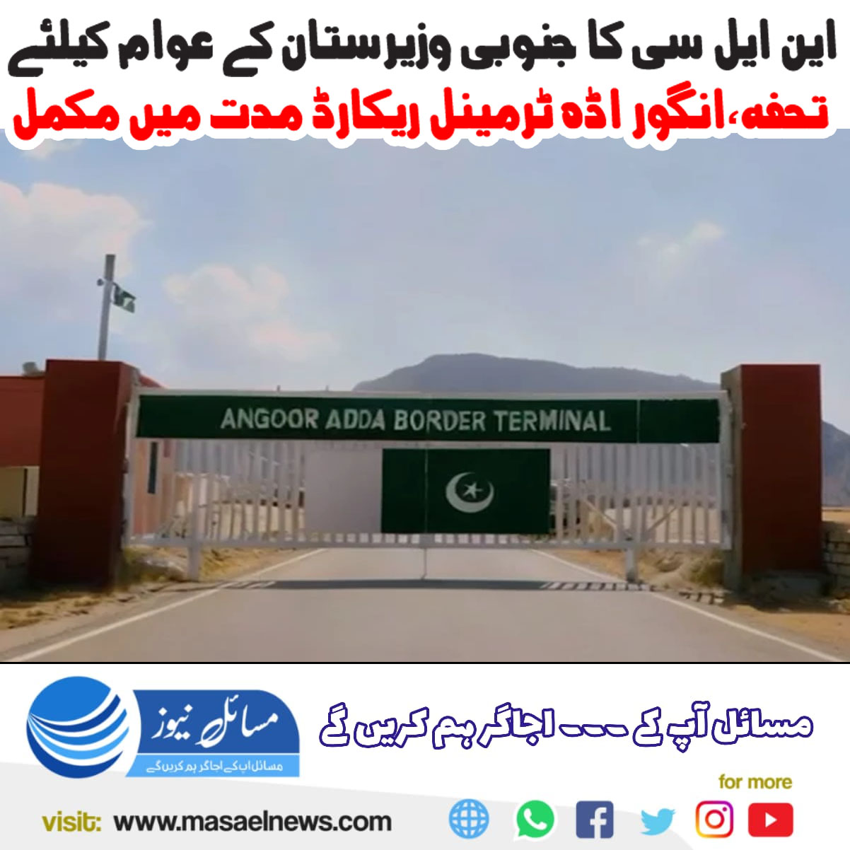 جنوبی وزیرستان (مسائل نیوز)این ایل سی نے جنوبی وزیرستان کے عوام کے لیے ایک اور تحفہ دیتے ہوئے انگور اڈہ ٹرمینل 30 دن کی ریکارڈ مدت میں مکمل کرلیا۔