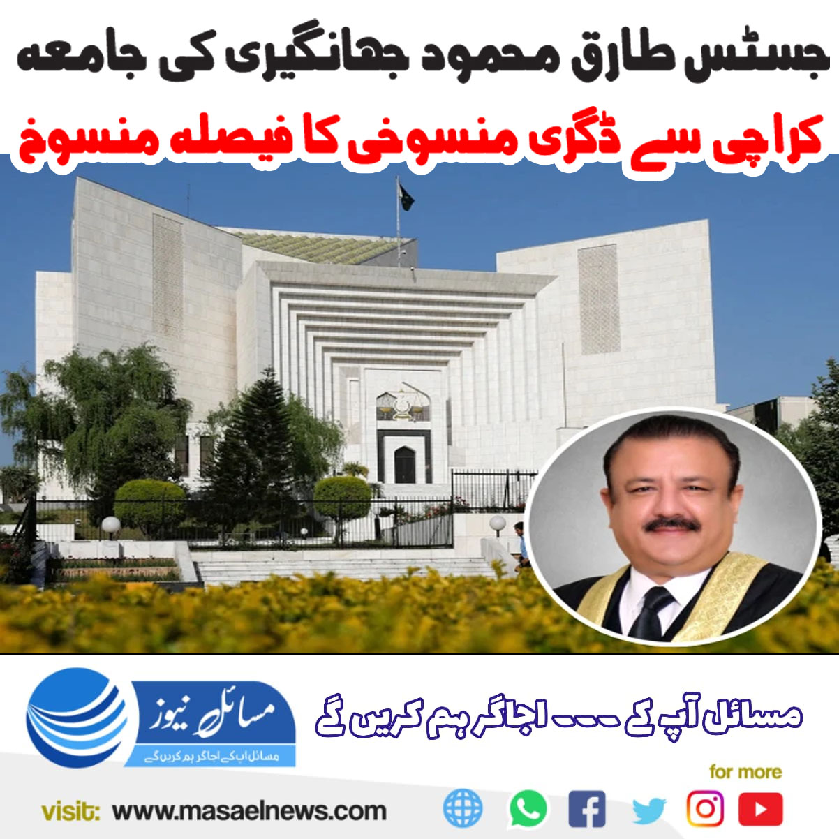 بعد ازاں عدالت نے جامعہ کراچی کا جسٹس طارق محمود جہانگیری کی ڈگری منسوخی کا فیصلہ معطل کردیا۔ عدالت نے سنڈیکیٹ اور ان فیئر مینز کمیٹی کی سفارشات پر مزید کسی کارروائی سے بھی روک دیا اور سماعت 24 اکتوبر تک ملتوی کردی۔