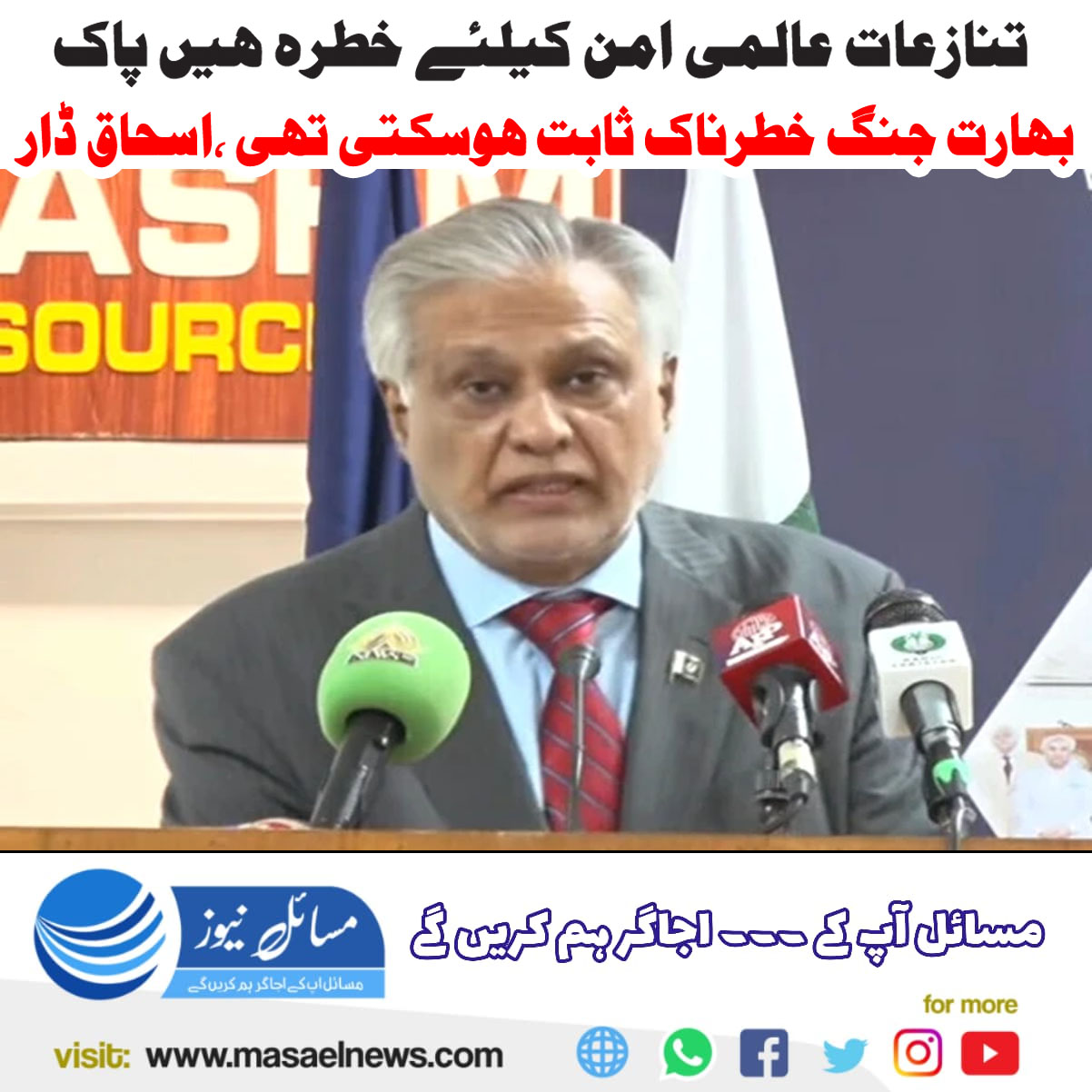 وفاقی دارالحکومت اسلام آباد میں ایک تقریب سے خطاب کرتے ہوئے نائب وزیراعظم محمد اسحاق ڈار نے دنیا میں جاری سلگتے تنازعات کو عالمی امن کے لیے خطرہ قرار دیا۔ انہوں نے کہا کہ مئی میں ہونے والی پاک بھارت جنگ بھی خطرناک ثابت ہوسکتی تھی۔
