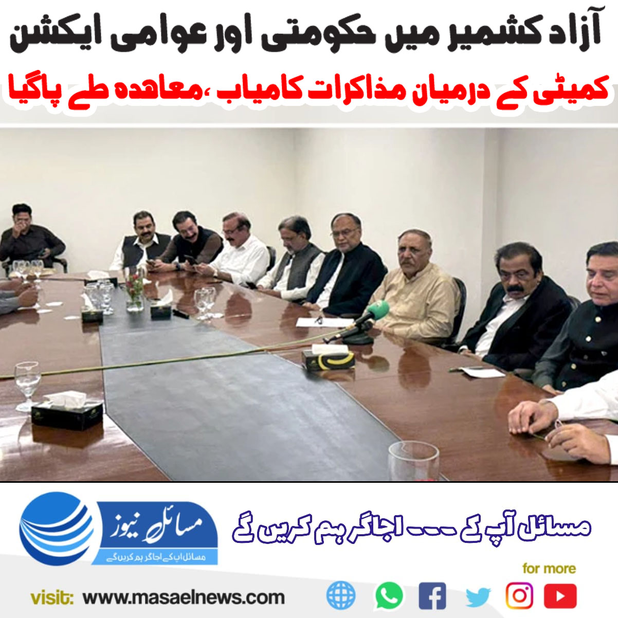 مظفرآباد میں مشترکہ پریس کانفرنس کے دوران وزیراعظم کے مشیر رانا ثنااللہ نے اعلان کیا کہ عوامی ایکشن کمیٹی کے تمام جائز مطالبات تسلیم کر لیے گئے ہیں۔ انہوں نے بتایا کہ فریقین کے درمیان معاملات کو مستقل بنیادوں پر حل کرنے کے لیے لیگل ایکشن کمیٹی قائم کر دی گئی ہے جو ہر 15 دن بعد بیٹھک کرے گی۔