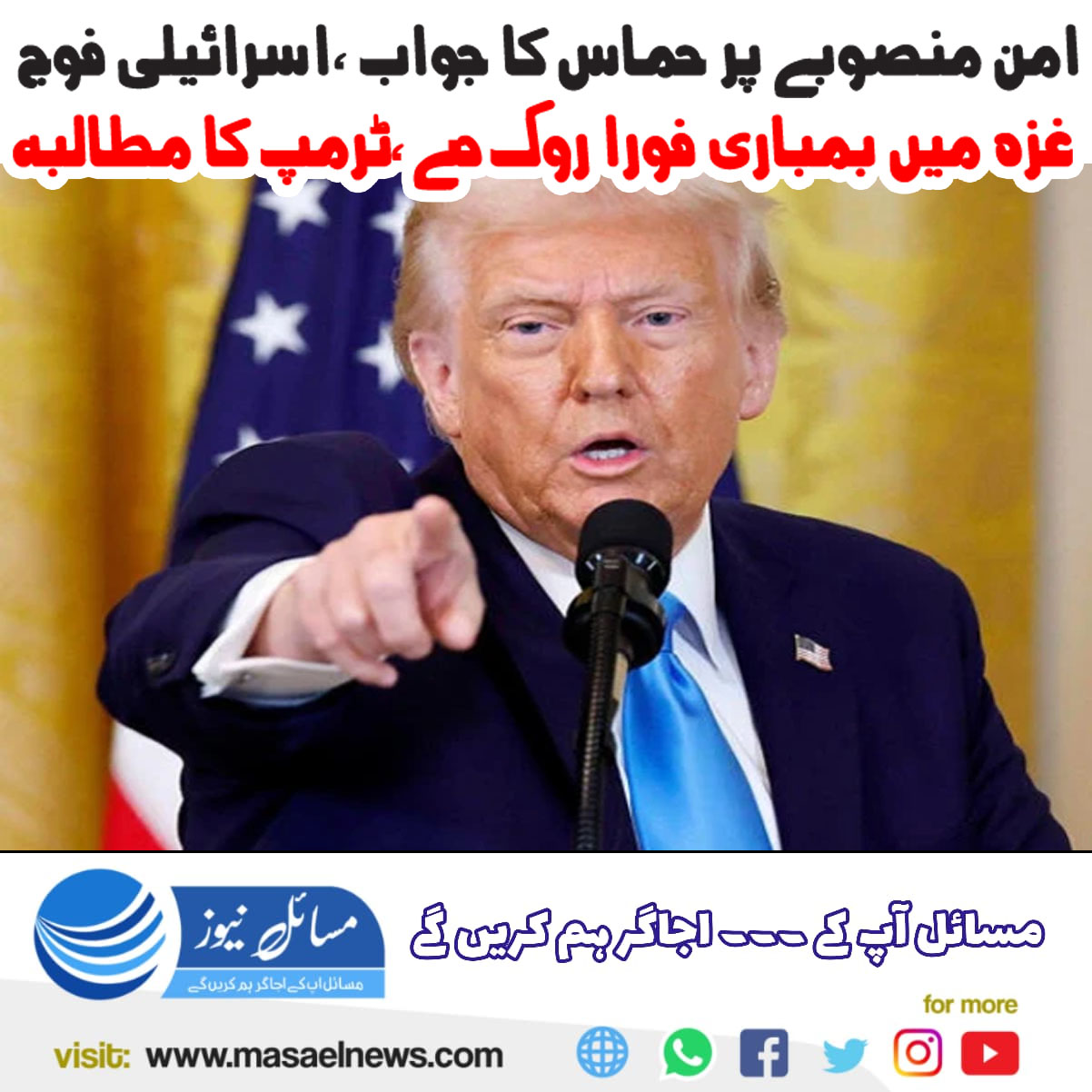 بین الاقوامی خبر رساں اداروں کے مطابق صدر ٹرمپ نے اپنے بیان میں کہا کہ حماس کے تازہ مؤقف سے ظاہر ہوتا ہے کہ وہ دیرپا امن کے لیے تیار ہے، لہٰذا اسرائیل کو فوری طور پر غزہ پر بمباری بند کر دینی چاہیے تاکہ یرغمالیوں کی محفوظ رہائی ممکن ہو سکے۔