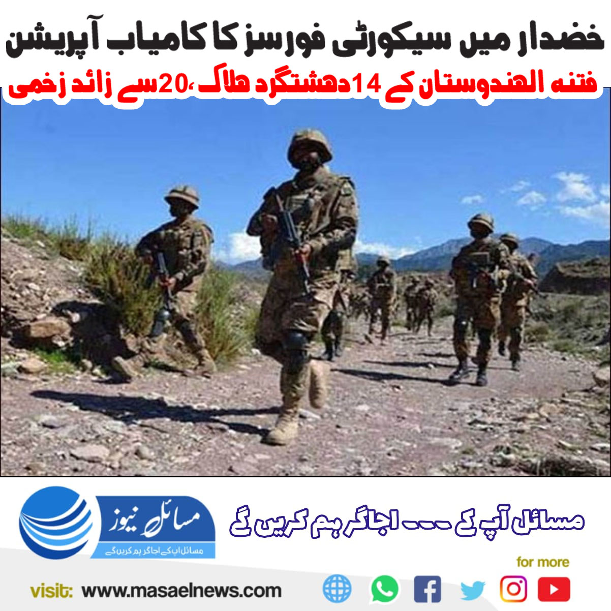 خضدار میں آپریشن کےدوران فتنتہ الہندوستان کے 14 سے زائد دہشت گرد ہلاک اور 20 سے زائد زخمی کردیے گئے۔