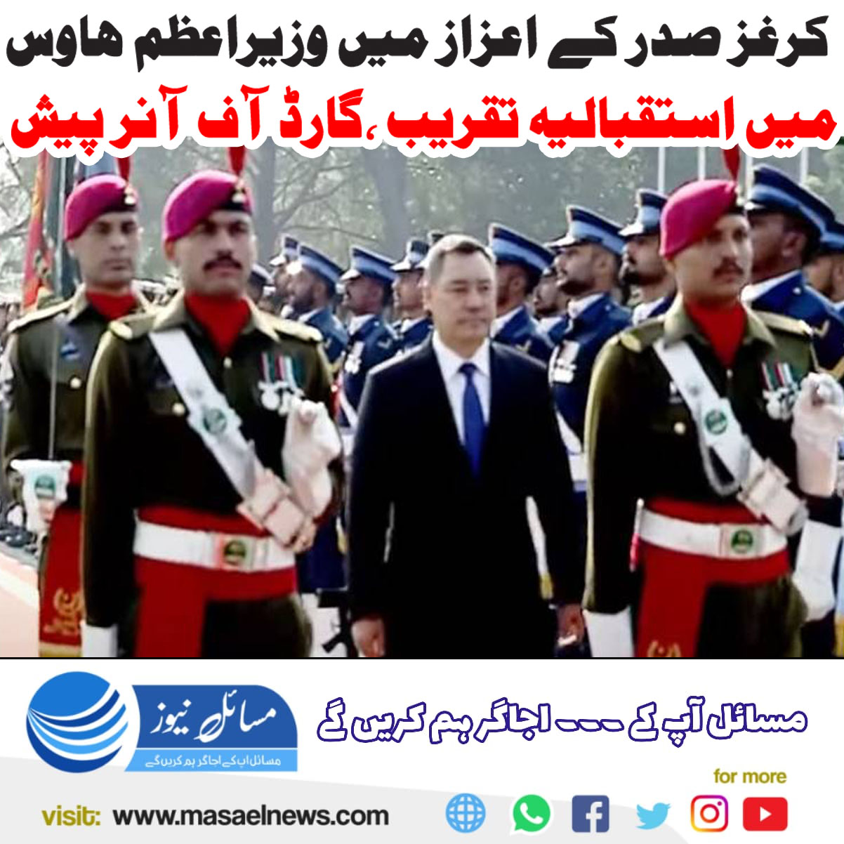 اسلام آباد(مسائل نیوز) کرغزستان کے صدر کے اعزاز میں وزیراعظم ہاؤس میں پروقار استقبالیہ تقریب کا انعقاد کیا گیا۔