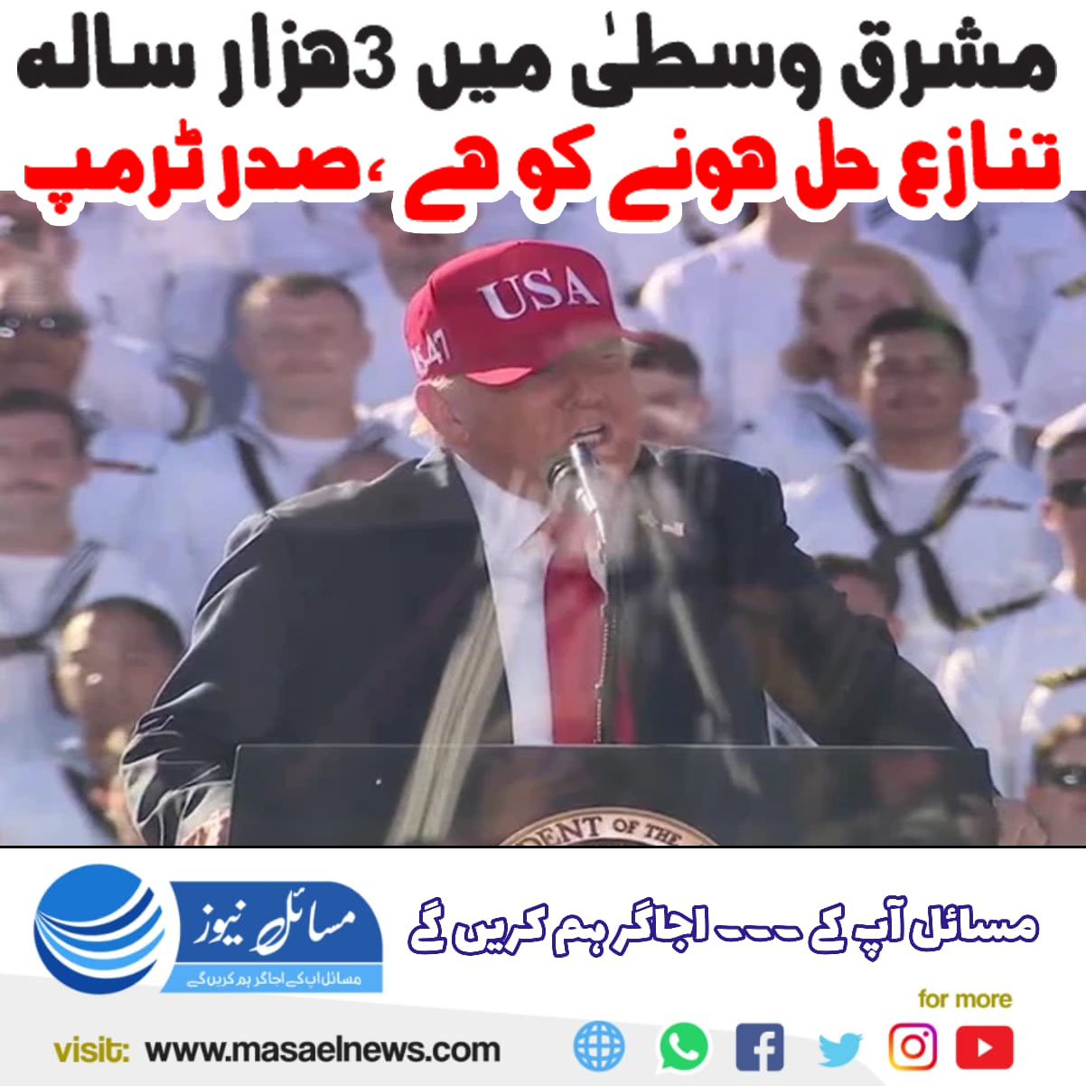 ورجینیا(مسائل نیوز)امریکی صدر ڈونلڈ ٹرمپ نے ورجینیا کے شہر نورفولک میں امریکی نیوی کے اہلکاروں سے خطاب کرتے ہوئے کہا ہے کہ مشرق وسطیٰ میں ایک تاریخی امن عمل شروع ہو چکا ہے اور تین ہزار سالہ پرانا مسئلہ جلد حل ہونے جا رہا ہے۔