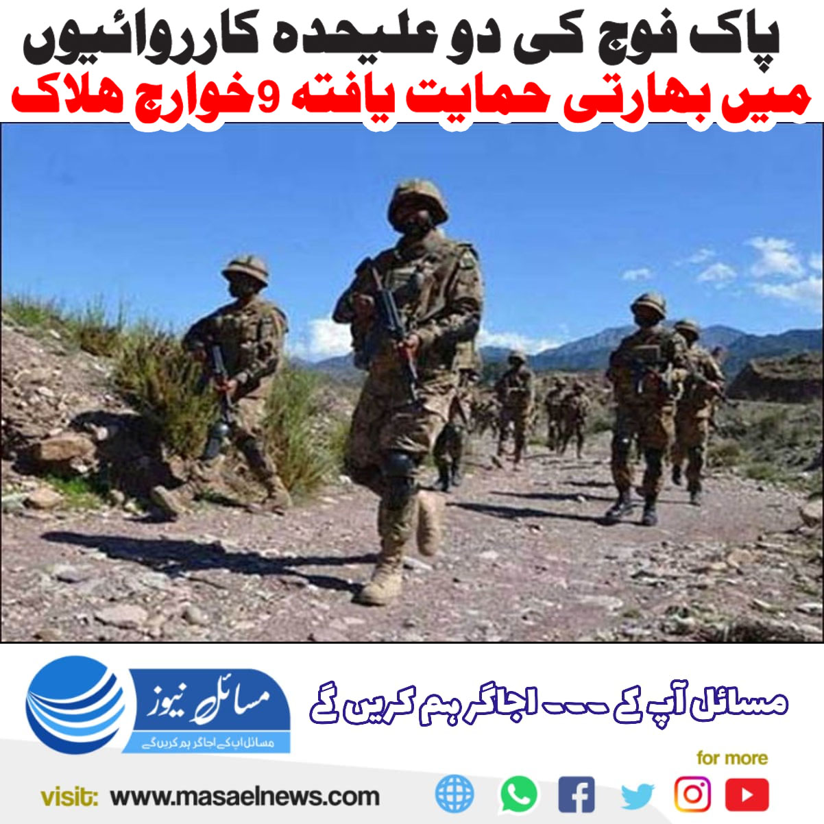 اسلام آباد(مسائل نیوز)خیبر پختونخوا میں پاک فوج کی دو علیحدہ کارروائیوں کے دوران بھارتی حمایت یافتہ تنظیم فتنہ الخوارج سے تعلق رکھنے والے 9 خوارج ہلاک ہو گئے۔