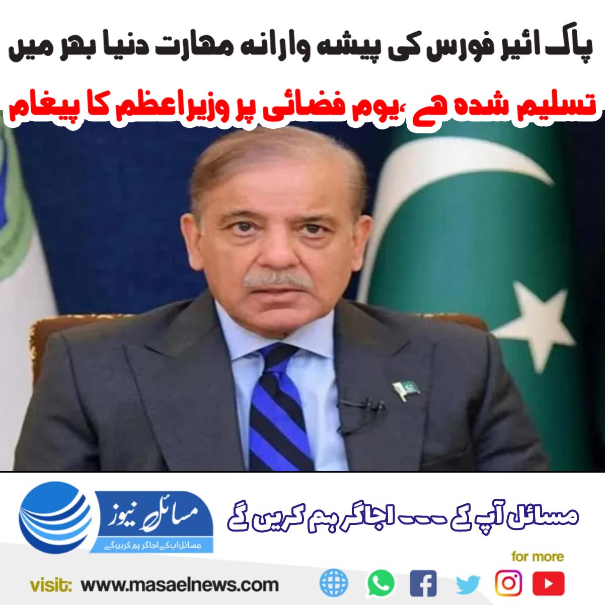اسلام آباد(مسائل نیوز)وزیراعظم پاکستان شہباز شریف نے 7 ستمبر کو یومِ فضائیہ کے موقع پر پاک فضائیہ کے بہادر سپوتوں اور ان کی بے مثال کارکردگی کو خراج تحسین پیش کیا۔