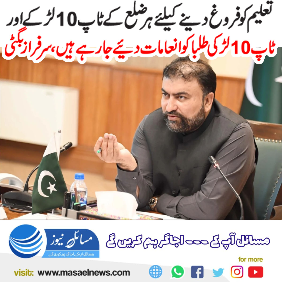 تعلیم کو فروغ دینے کے لیے ہر ضلع کے ٹاپ 10 لڑکے اور ٹاپ 10 لڑکی طلبا کو انعامات دیے جا رہے ہیں،میر سرفراز بگٹی