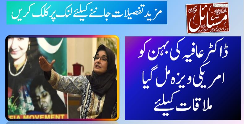 اسلام آباد (ویب ڈسک) اسلام آباد ہائیکورٹ میں ڈاکٹر عافیہ صدیقی کی امریکی قید سے رہائی اور پاکستانی منتقلی کی درخواست کی سماعت ہوئی۔ایڈیشنل اٹارنی جنرل منور اقبال دوگل نے اسلام آباد ہائیکورٹ کو آگاہ کیا کہ امریکہ میں ملاقات کے لیے عافیہ صدیقی کی بہن فوزیہ صدیقی کو 5 سال کا امریکی ویزہ مل گیا ہے۔انہوں نے کہا کہ عافیہ صدیقی سے 29 سے 31 مئی تک تین دن کے دوران امریکی جیل میں ملاقات طے پا گئی۔ فوزیہ صدیقی اور امریکی وکیل کلائیو سمتھ عافیہ صدیقی سے ملاقات کریں گے۔
