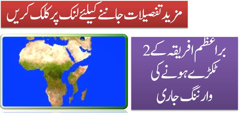 میل آن لائن کے مطابق سائنسدانوں نے کہا ہے کہ براعظم افریقہ میں لگ بھگ 2کروڑ 20لاکھ سال قبل 2ہزار میل لمبی ایک دراڑ پڑی تھی جو اب ہر سال 1 انچ بڑھتی جا رہی ہے اورکچھ دہائیوں میں براعظم افریقہ ٹوٹ کر 2حصوں میں تقسیم ہو جائے گا۔