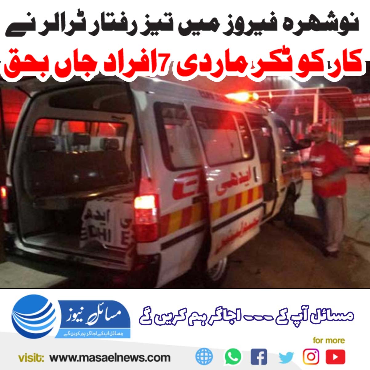یہ افسوس ناک واقعہ نوشہرو فیروز میں سدھوجا کے قریب قومی شاہراہ پر پیش آیا جہاں تیز رفتار ٹرالر گاڑی سے جا ٹکرایا ، حادثے میں 7 افراد جاں بحق ہوگئے۔