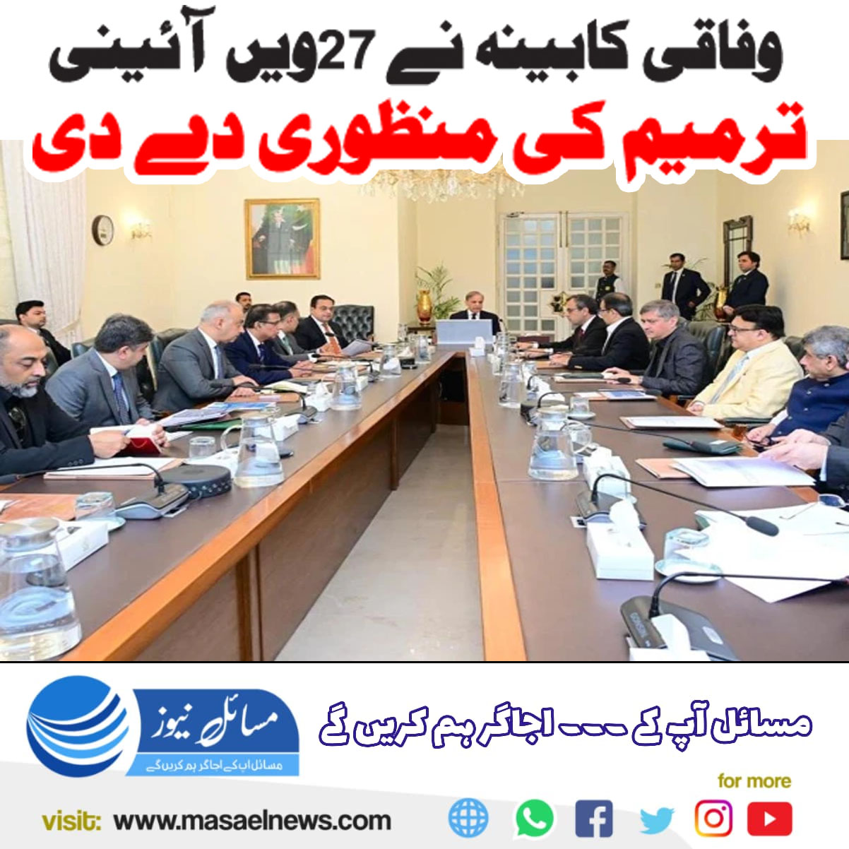 اسلام آباد(مسائل نیوز)وفاقی کابینہ نے 27ویں آئینی ترمیم کی منظوری دے دی۔