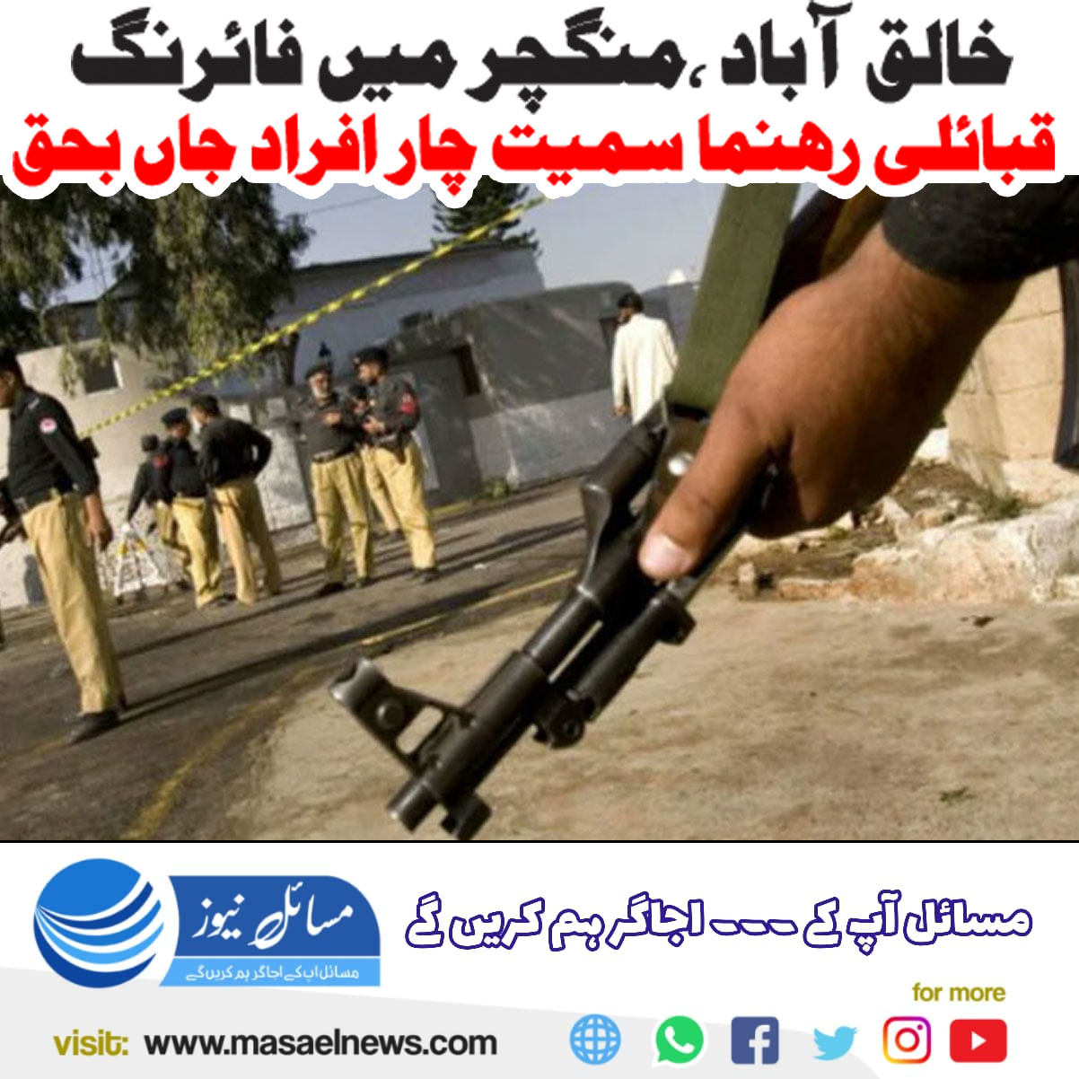 قلات (مسائل نیوز)قلات کی تحصیل خالق آباد کے علاقے سربند ایریا میں فائرنگ کے ایک واقعے میں قبائلی رہنما شاکر سعداللہ لانگو، ان کے بھائی شاکر خیراللہ لانگو سمیت چار افراد جاں بحق ہوگئے۔ لیویز ذرائع کے مطابق واقعہ کلی غلام جان کے قریب پیش آیا جہاں نامعلوم مسلح افراد نے اچانک فائرنگ کردی جس کے نتیجے میں شاکر سعداللہ، شاکر خیراللہ پسران مولا بخش، محمد کریم ولد محمد سکنہ حال کوئٹہ اور محمد ظاہر ولد خالقداد اقوام لانگو موقع پر ہی دم توڑ گئے۔ فائرنگ کے بعد حملہ آور فرار ہوگئے جبکہ لیویز فورس نے علاقے کو گھیرے میں لے کر تحقیقات کا آغاز کردیا ہے۔ انتظامیہ کے مطابق واقعے کی وجوہات معلوم کرنے کے لیے مختلف پہلوؤں سے تفتیش جاری ہے۔