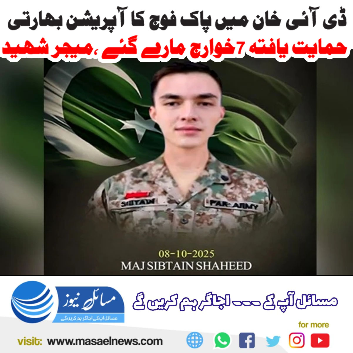 راولپنڈی(مسائل نیوز)ڈی آئی خان میں پاک فوج کے آپریشن میں بھارتی حمایت یافتہ 7 خوارج مارے گئے جب کہ میجر سبطین حیدر نے جام شہادت نوش کرلیا۔
