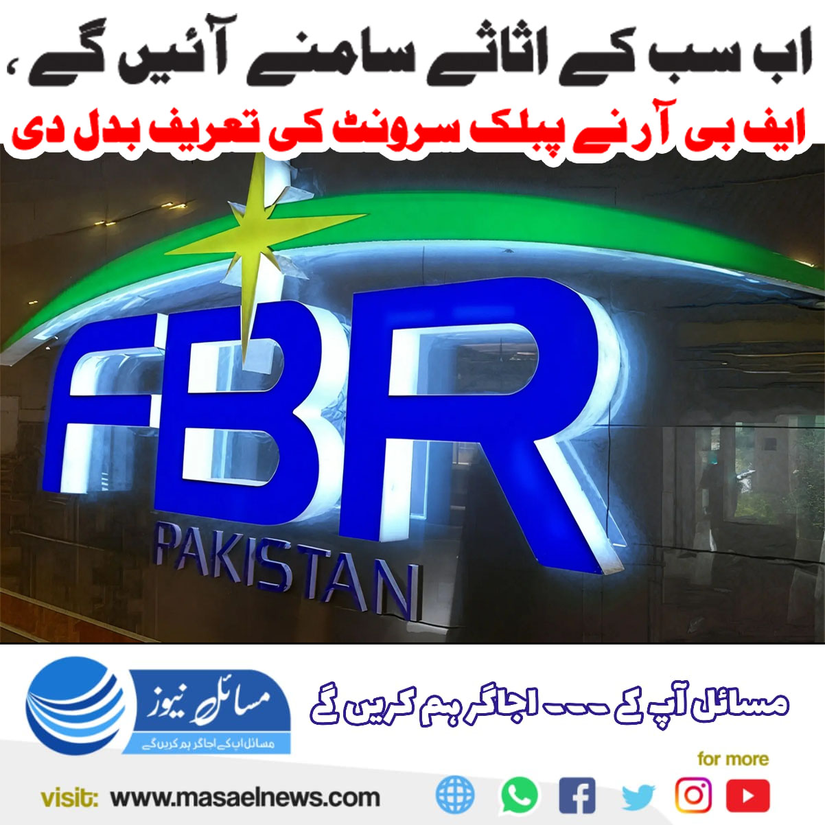 اسلام آباد(مسائل نیوز)فیڈرل بورڈ آف ریونیو (ایف بی آر) نے سرکاری ملازمین کے اثاثوں کی تفصیلات سے متعلق قوانین میں اہم تبدیلی کرتے ہوئے ’’پبلک سرونٹ‘‘ یعنی ’’سرکاری عہدیدار‘‘ کی نئی تعریف جاری کر دی ہے۔
