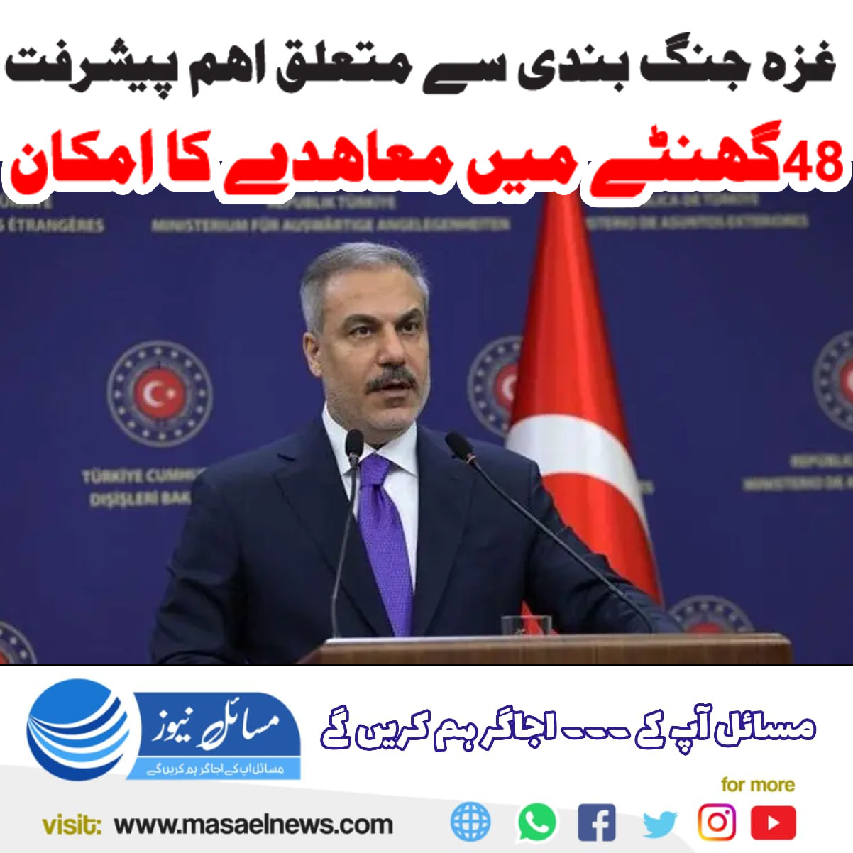 ترک وزیرِ خارجہ جو ان دنوں شام کے سرکاری دورے پر ہیں۔ ان کا مزید کہنا تھا کہ مصر میں جاری امن مذاکرات میں دونوں فریقوں نے فلسطینی قیدیوں اور اسرائیلی یرغمالیوں کی رہائی کے لیے غیر معمولی سنجیدگی اور عزم کا اظہار کیا ہے۔