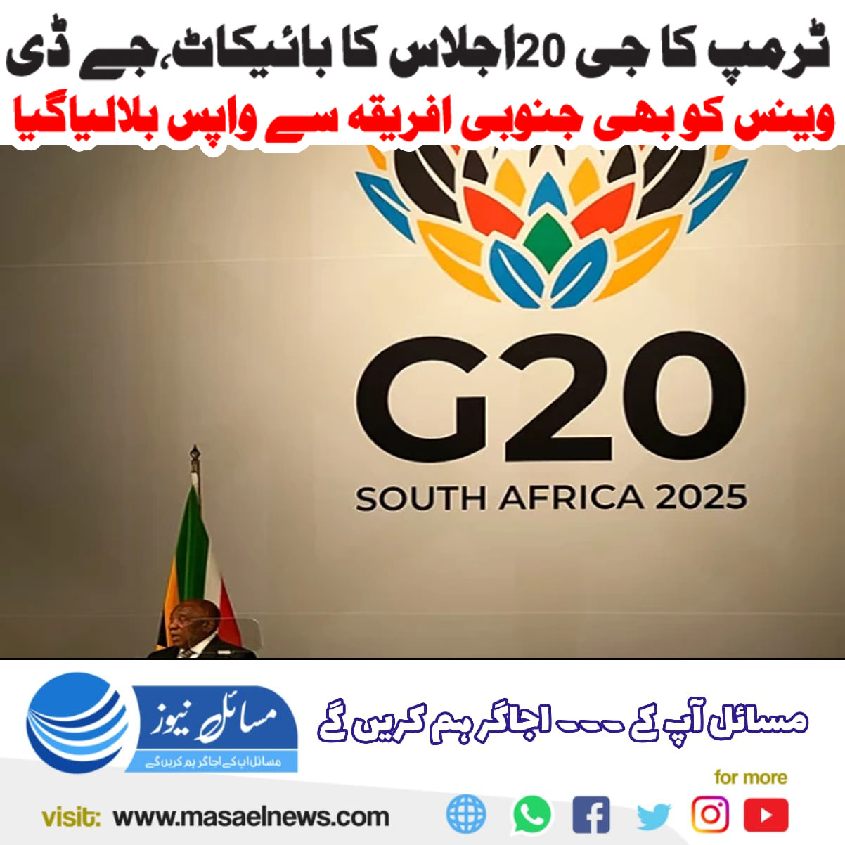 ٹرمپ کا جی 20 اجلاس کا بائیکاٹ، جے ڈی وینس کو بھی جنوبی افریقا سے واپس بلا لیا گیا