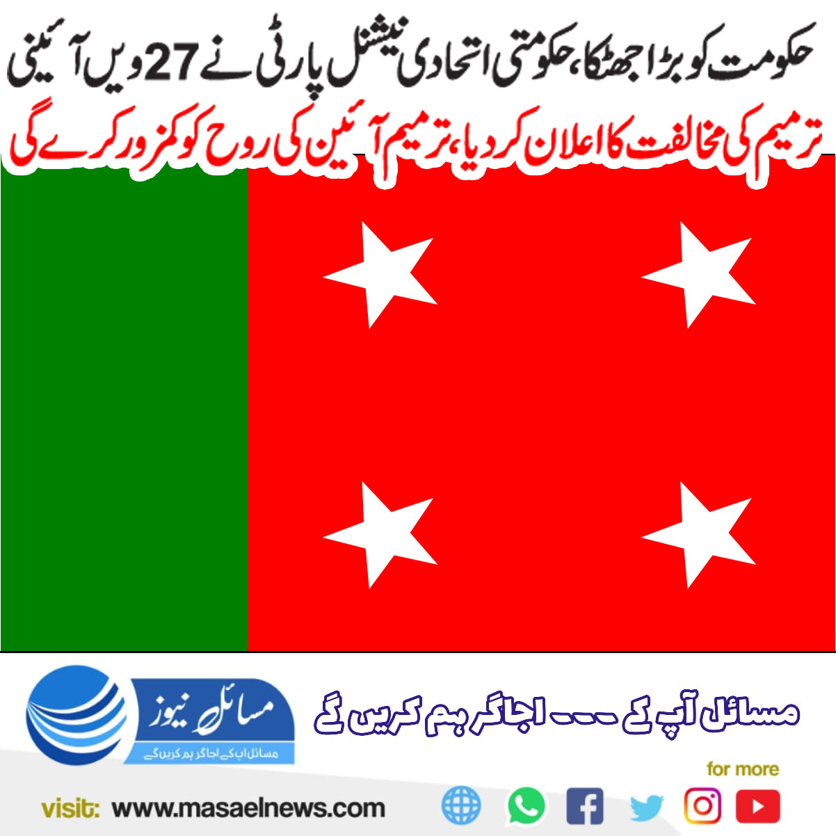 کوئٹہ(مسائل نیوز) حکومتی اتحادی جماعت نیشنل پارٹی نے مجوزہ 27 ویں آئینی ترمیم کی پارلیمنٹ میں مخالفت کا اعلان کر دیا ہے، جسے حکمراں اتحاد کے لیے ایک بڑا دھچکا سمجھا جا رہا ہے۔ نیشنل پارٹی کے مرکزی ترجمان نے ایک بیان میں کہا کہ سینٹ میں مسودہ پیش ہونے اور اس پر تفصیلی قانونی مشاورت کے بعد پارٹی کے آئینی اداروں نے اکثریتی رائے سے اس ترمیم کو مسترد کر دیا ہے۔ ترجمان نے واضح کیا کہ 27 ویں آئینی ترمیم دراصل آئین کی بنیادی روح اور آئینی ڈھانچے کو کمزور کرنے کے مترادف ہے۔ نیشنل پارٹی، جس کے قومی اسمبلی اور سینٹ میں بالترتیب ایک ایک ممبر ہیں، اب پارلیمنٹ کے دونوں ایوانوں میں اس ترمیم کی کھل کر مخالفت کرے گی۔