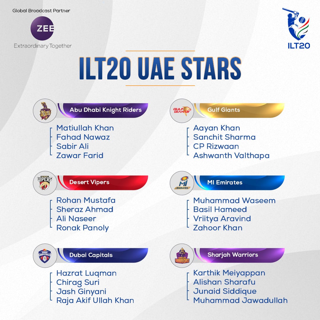 دبئی کیپٹلز میں حضرت لقمان(پاکستان)،چراغ سوری،جش گنیانی،راجہ عاکف اللہ خان(پاکستان)سلیکٹ کیا گیا اس کے علاوہ گلف جائنٹس میں آیان خان،سنچیت شرما،سی پی رضوان،اشونتھ والتھاپا اورایم آئی ایمریٹس کی ٹیم میں محمد وسیم(پاکستان)،تلسی حمید،وریتیا اروند،ظہور خان(پاکستان) اورشارجہ واریرز نے کارتک میپن ،عالیشان شرافو، جنید صدیق(پاکستان)، محمد جواد اللہ(پاکستان) کو چنا ۔ انٹرنیشنل لیگ ٹی ٹوٹنی میں چھ ٹیمیں شامل ہیں جبکہ ان کے درمیان چونتیس میچز کھیلے جائیں گے لیگ کا افتتاحی میچ تیرہ جنوری کو دبئی انٹرنیشنل کرکٹ اسٹیڈیم میں کھیلا جائے گا ۔
