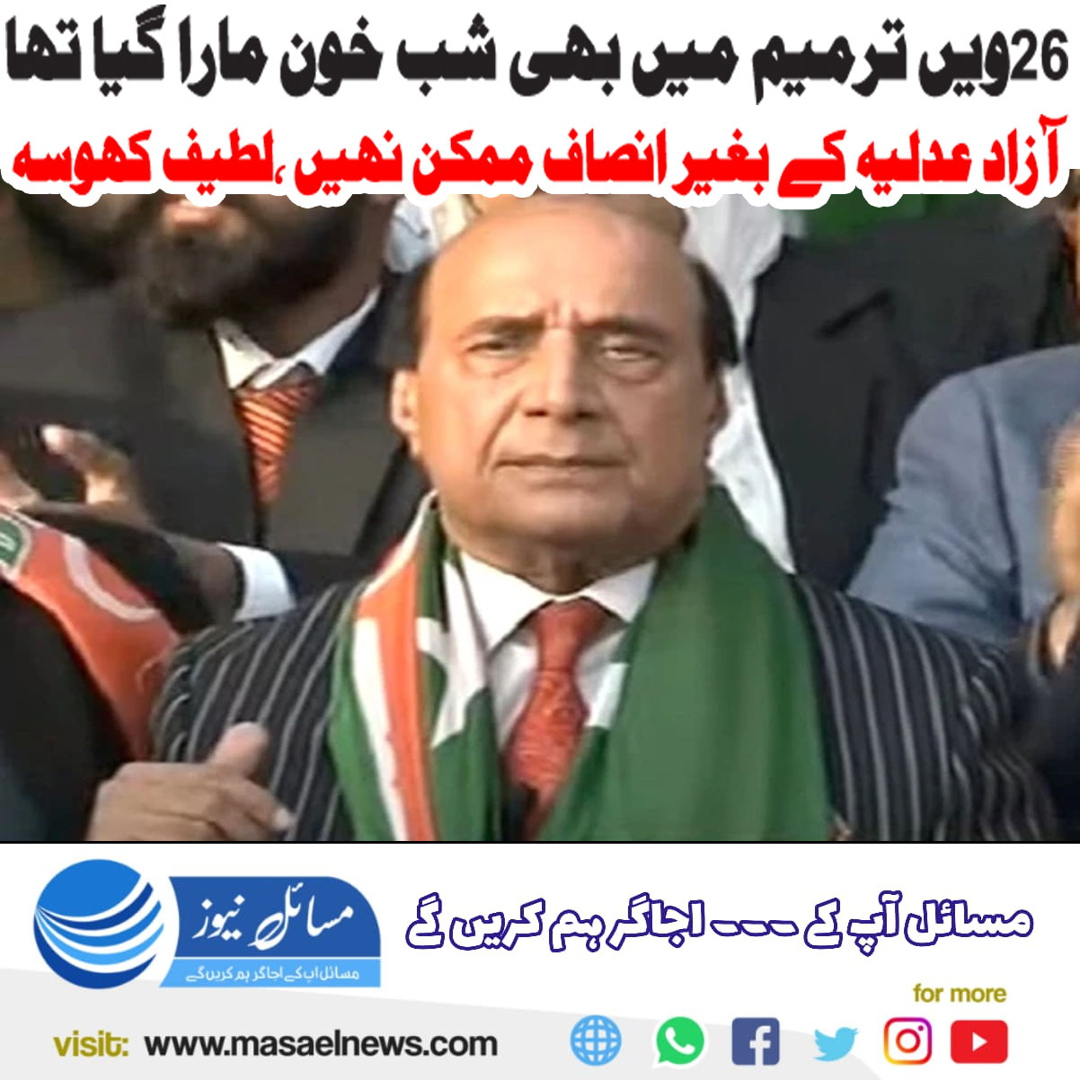 وفاقی دارالحکومت میں پریس کانفرنس سے خطاب کرتے ہوئے سردار لطیف کھوسہ نے کہا کہ فسطائیت نے نظام مکمل طور پر خراب کردیا ہے۔ 26ویں ترمیم میں بھی اسی طرح شب خون مارا گیا تھا۔ کس طرح آدھی رات کو حالات بدلے گئے۔ انہوں نے کہا کہ آزاد عدلیہ کے بغیر معاشرے میں انصاف ممکن نہیں ہے۔