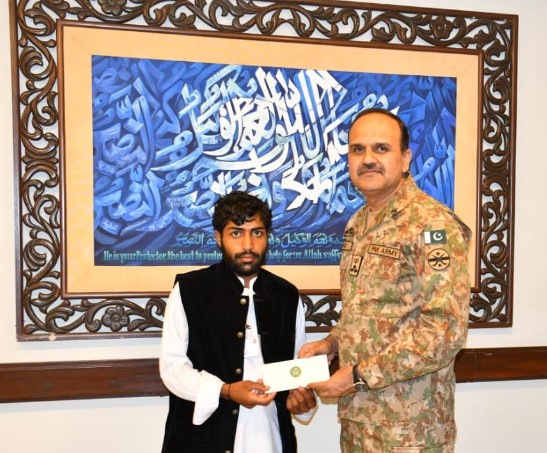 بریگیڈئیر عابد مظہر نے چیف آف آرمی اسٹاف جنرل قمر جاوید باجوہ کیجانب سے آئل ٹینکر ڈرائیور فیصل بلوچ کو ان کی انسانی خدمت کے اعتراف میں تنہیتی شیلڈ اور نقد انعام دیا۔