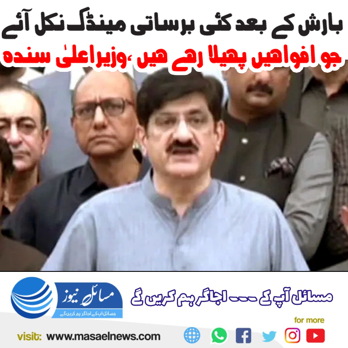 کراچی میں اربن فلڈنگ کے حوالے سے تنقید کا جواب دیتے ہوئے وزیراعلیٰ نے کہا کہ بارش کے بعد کئی برساتی مینڈک سامنے آ گئے ہیں جو بے بنیاد افواہیں پھیلا رہے ہیں۔ ایسے عناصر لسانی اور سیاسی تفریق پیدا کرنے کی کوشش نہ کریں کیونکہ قوم پہلے ہی اس کی بھاری قیمت ادا کر چکی ہے۔