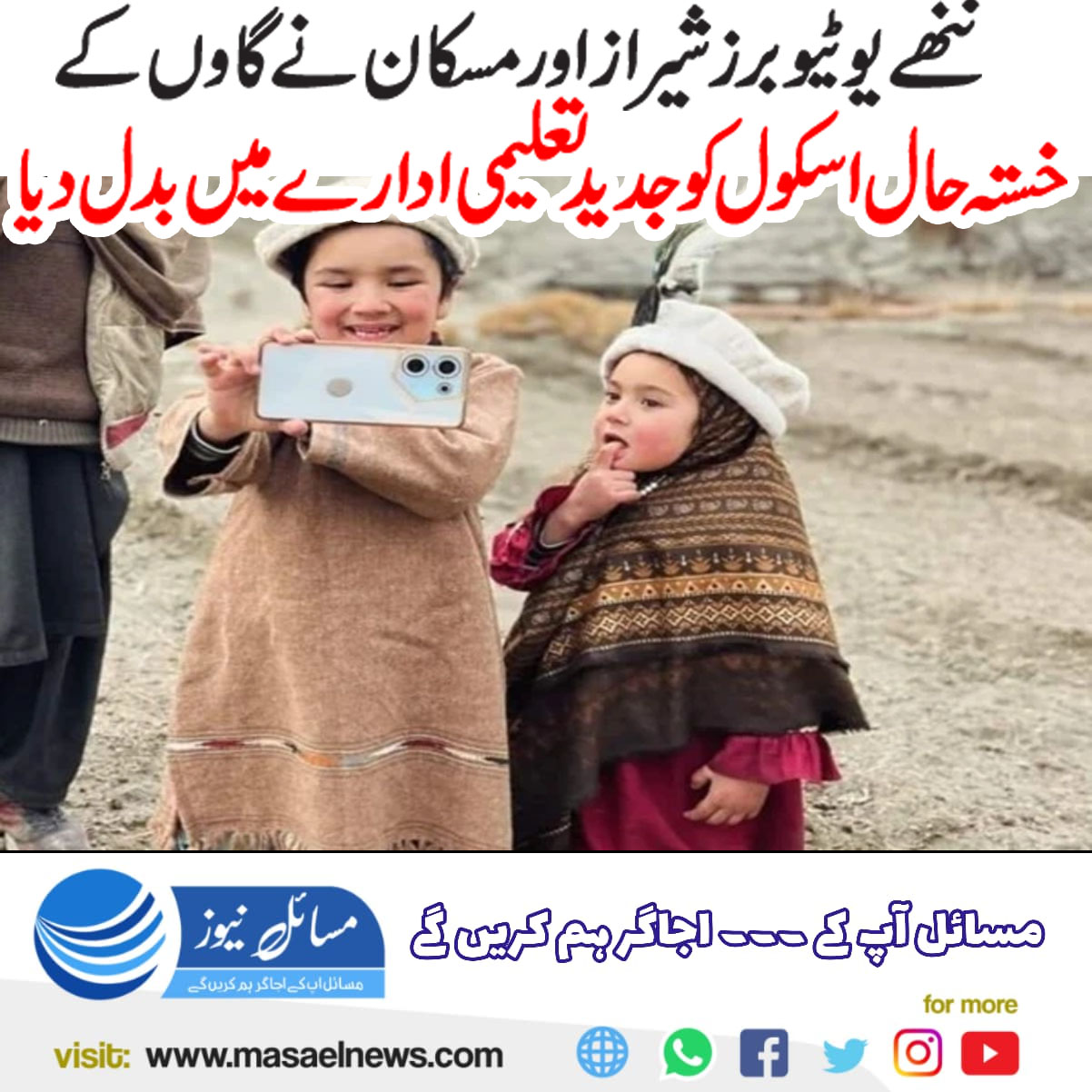 اسلام آباد(مسائل نیوز)پاکستان کے مشہور ترین ننھے یوٹیوبرز محمد شیراز اور مسکان نے سوشل میڈیا سے حاصل ہونے والی آمدنی کو مثبت مقصد کے لیے استعمال کرتے ہوئے اپنے گاؤں کے پرانے، خستہ حال اسکول کو جدید تعلیمی ادارے میں تبدیل کر دیا ہے۔