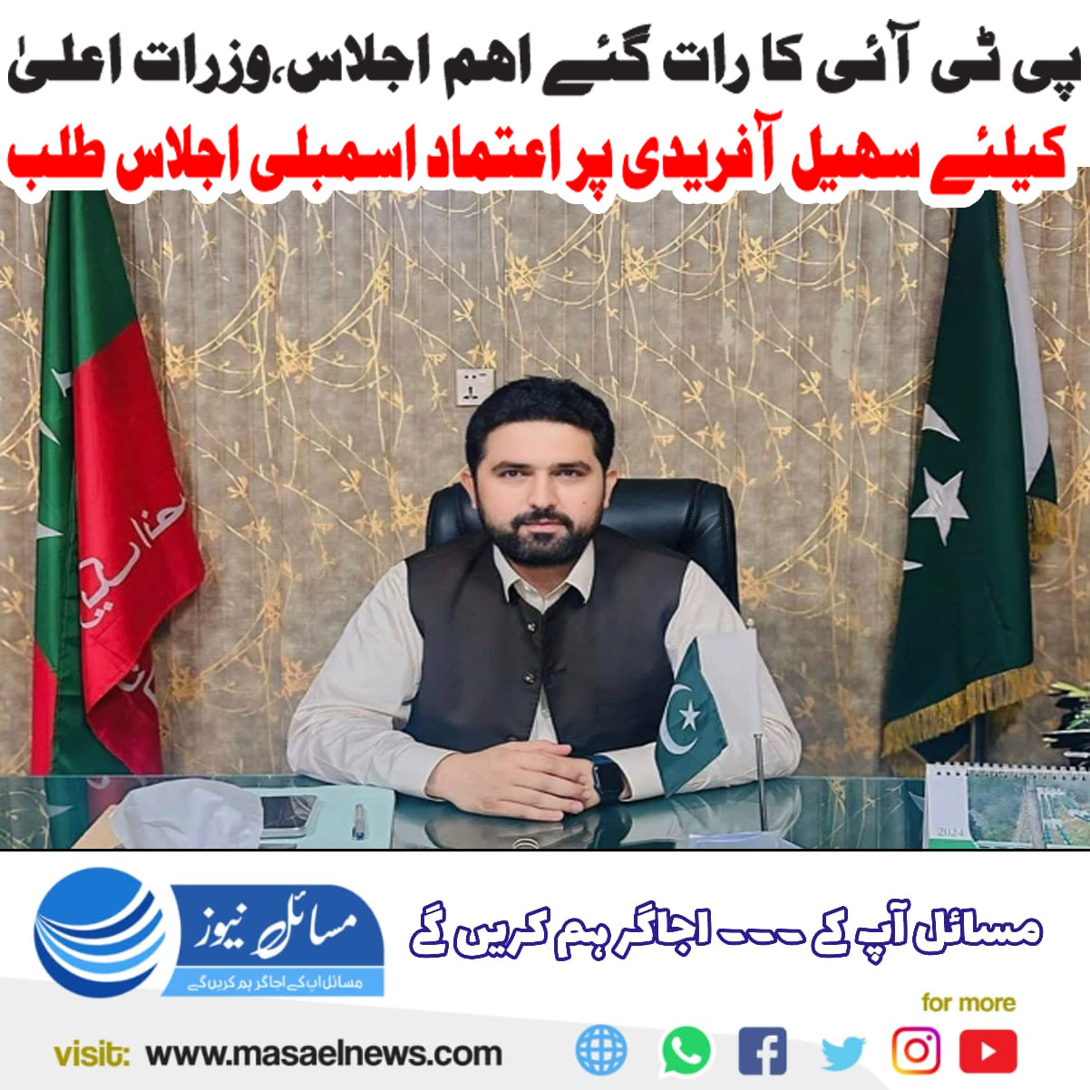 پشاور(مسائل نیوز)پی ٹی آئی قیادت نے رات گئے اہم اجلاس میں وزارت اعلیٰ کے لیے سہیل آفریدی پر اعتماد کا اظہار کرتے ہوئے پختونخوا اسمبلی کا اجلاس آج طلب کیا ہے۔