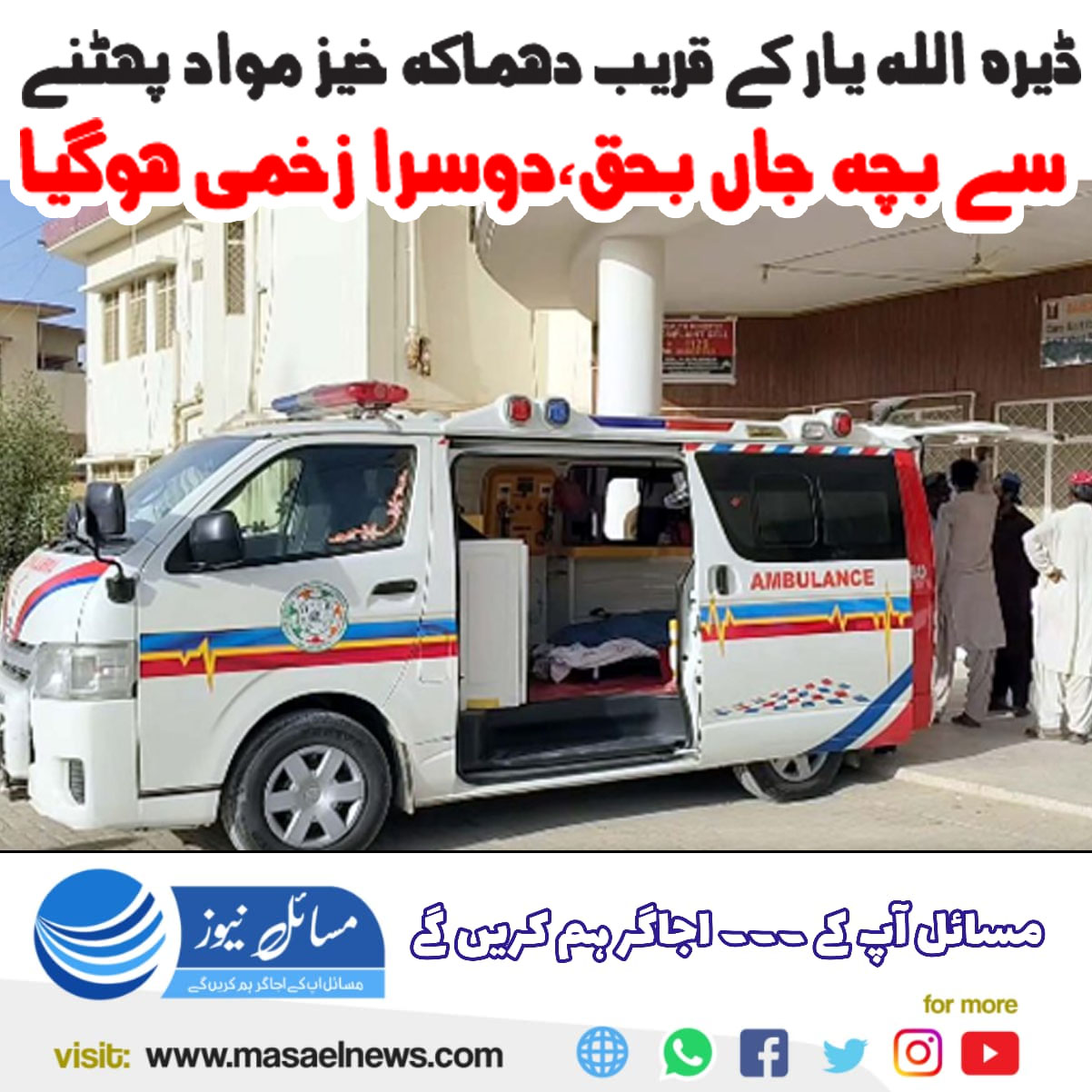 ڈیرہ اللہ یار (مسائل نیوز)ڈیرہ اللہ یار کے قریب دھماکہ خیز مواد پھٹنے سے بچہ جاں بحق جبکہ دوسرا زخمی ہوگیا پولیس کے مطابق ڈیرہ اللہ یار کے قریب زیرو پوائنٹ پر دھماکہ خیز مواد پھٹنے سے کچہرہ چننے والا بچہ ذاکر ڈومکی جاں بحق جبکہ سراج ڈومکی شدید زخمی ہوگیا پولیس نے لاش اور زخمی کو فوری ہسپتال پہنچایا جہاں ضروری کارروائی کے بعد لاش ورثا کے حوالے کردی گئی