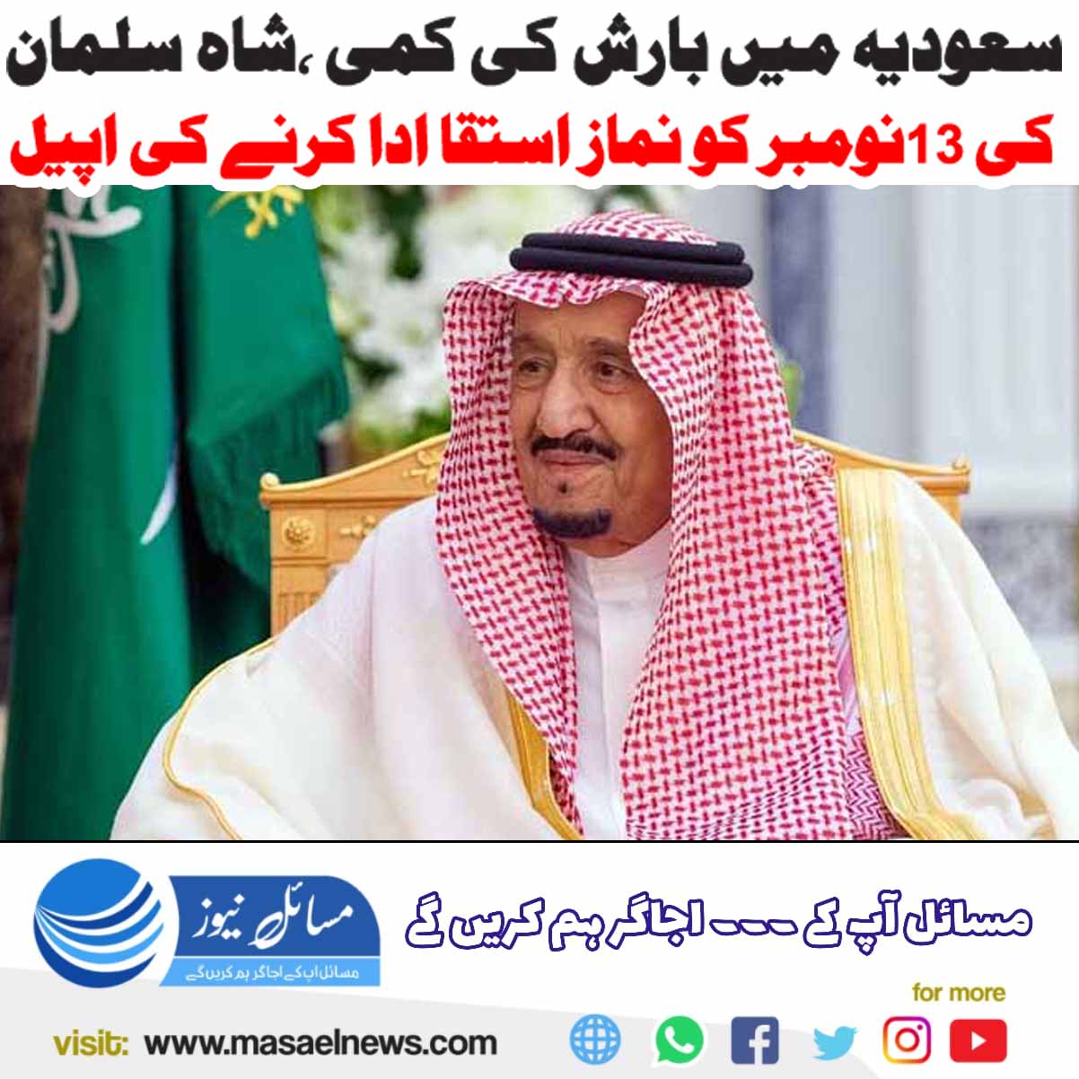 ریاض(مسائل نیوز) سعودی فرماں روا شاہ سلمان بن عبدالعزیز نے بارش کی کمی کے باعث 13 نومبر کو مملکت بھر میں نماز استسقا ادا کرنے کی اپیل کی ہے۔
