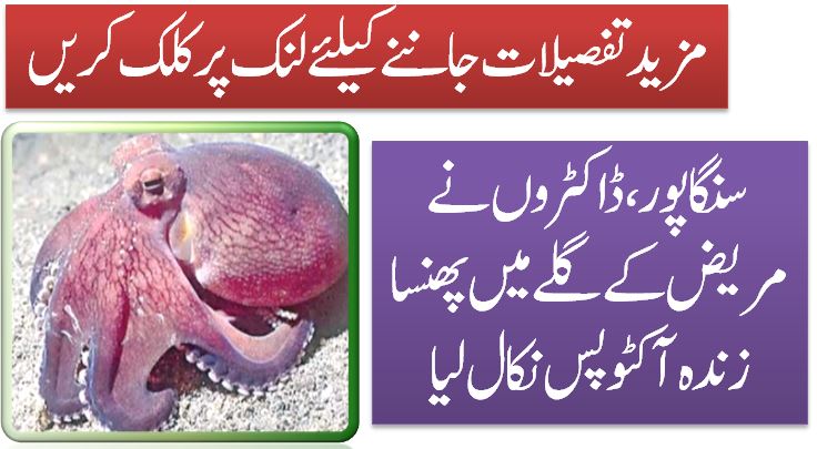 سنگاپور میں ڈاکٹرز اس وقت حیران و پریشان رہ گئے جب انہوں نے ایک مریض کے ایسو فیگس (منہ سے معدے تک جانے والی غذائی نالی) میں ایک زندہ آکٹوپس کو موجود پایا۔