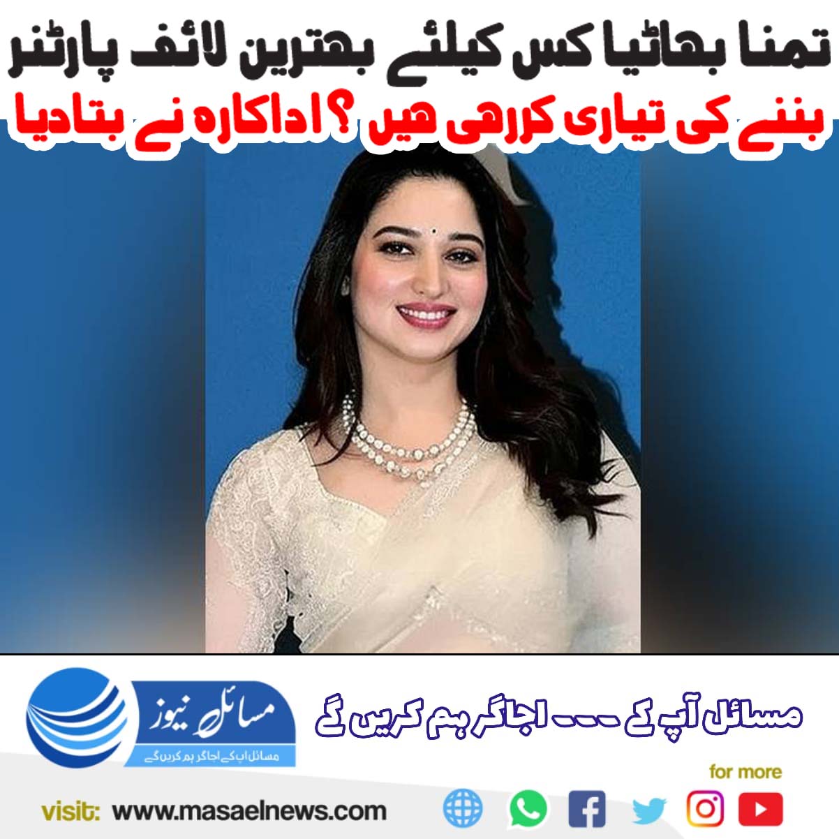 ممبئی(مسائل نیوز)معروف بالی وڈ اداکارہ تمنا بھاٹیا نے انکشاف کیا ہے کہ وہ اپنی آئندہ زندگی میں کسی خوش نصیب شخص کے لیے ایک بہترین لائف پارٹنر بننے کی تیاری کر رہی ہیں۔