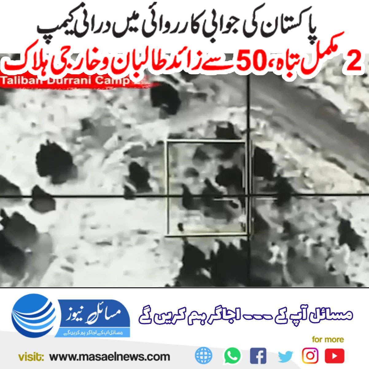 راولپنڈی (مسائل نیوز)پاکستان نے منہ توڑ جواب دیتے ہوئے طالبان فورسز کے خلاف کامیاب اسٹرائیک کرتے ہوئے درانی کیمپ 2 کو مکمل تباہ کر دیا۔