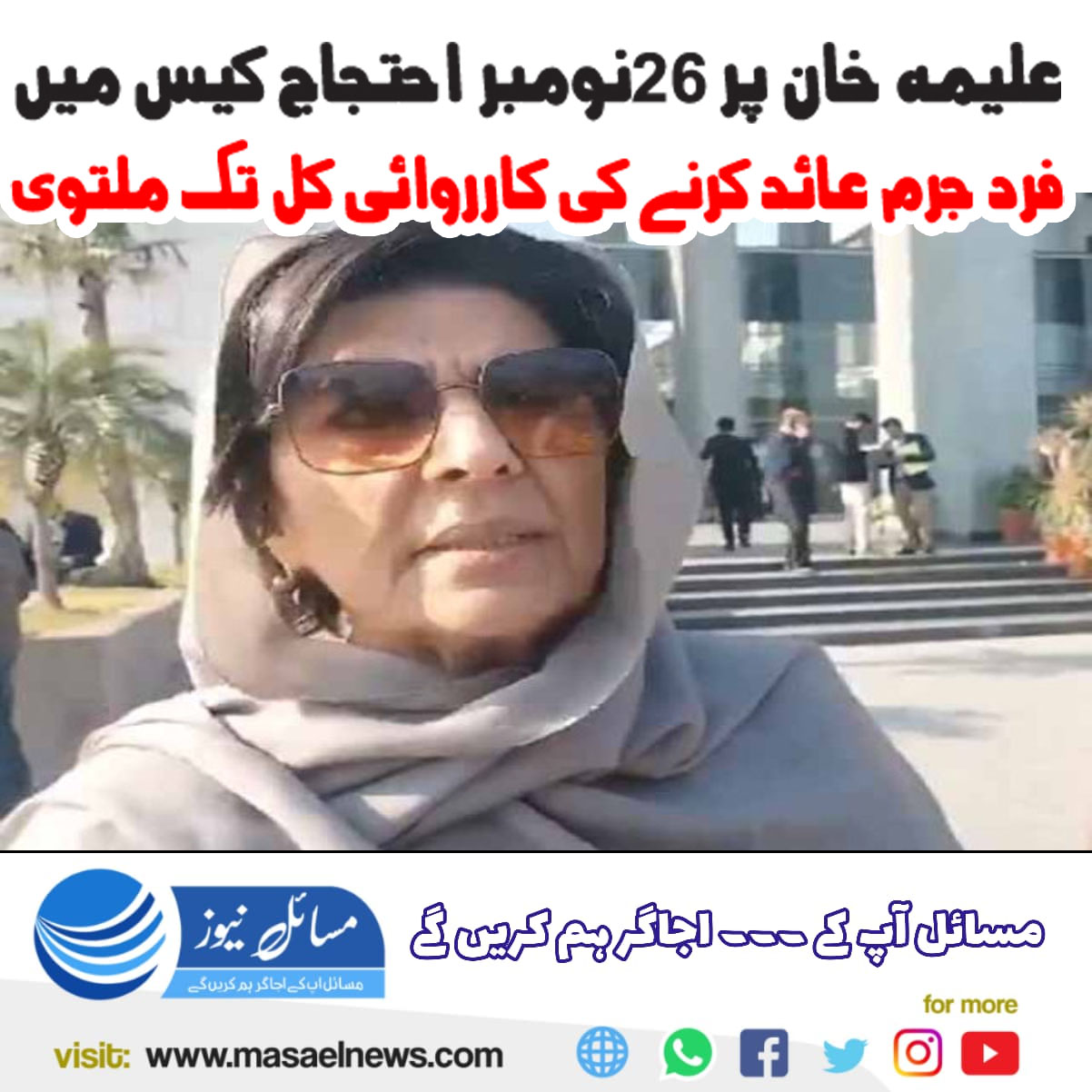 تھانہ صادق آباد میں درج 26 نومبر احتجاج کیس کے سلسلے میں عدالت نے علیمہ خان کی ایک دن کی حاضری معافی کی درخواست منظور کرتے ہوئے فرد جرم کی کارروائی کل منگل 14 اکتوبر تک ملتوی کردی۔