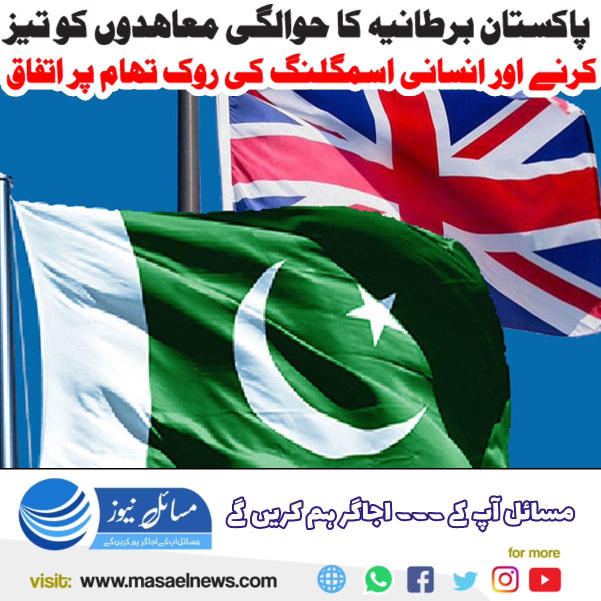 اسلام آباد(مسائل نیوز) پاکستان اور برطانیہ نے حوالگی سے متعلق مفاہمت کی پانچ یادداشتوں (ایم او یوز) کو حتمی شکل دینے میں تیزی لانے اور انسانی اسمگلنگ اور آن لائن بچوں کو ہراساں کرنے کے واقعات کی روک تھام کے لیے مشترکہ کوششوں کو تیز کرنے کا عزم کیا ہے۔
