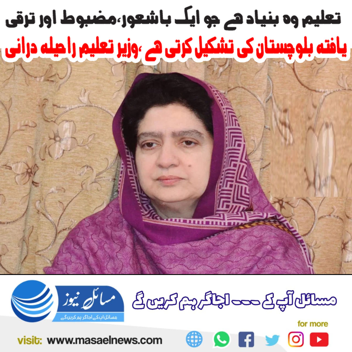 تعلیم وہ بنیاد ہے جو ایک باشعور، مضبوط اور ترقی یافتہ بلوچستان کی تشکیل کرتی ہے،صوبائی وزیر تعلیم راحیلہ حمید خان درانی