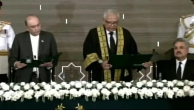 آئینی عدالت کے سربراہ جسٹس امین الدین ایوان صدر میں حلف اٹھایا، صدر مملکت آصف علی زرداری نے آئینی عدالت کے سربراہ سے حلف لیا۔