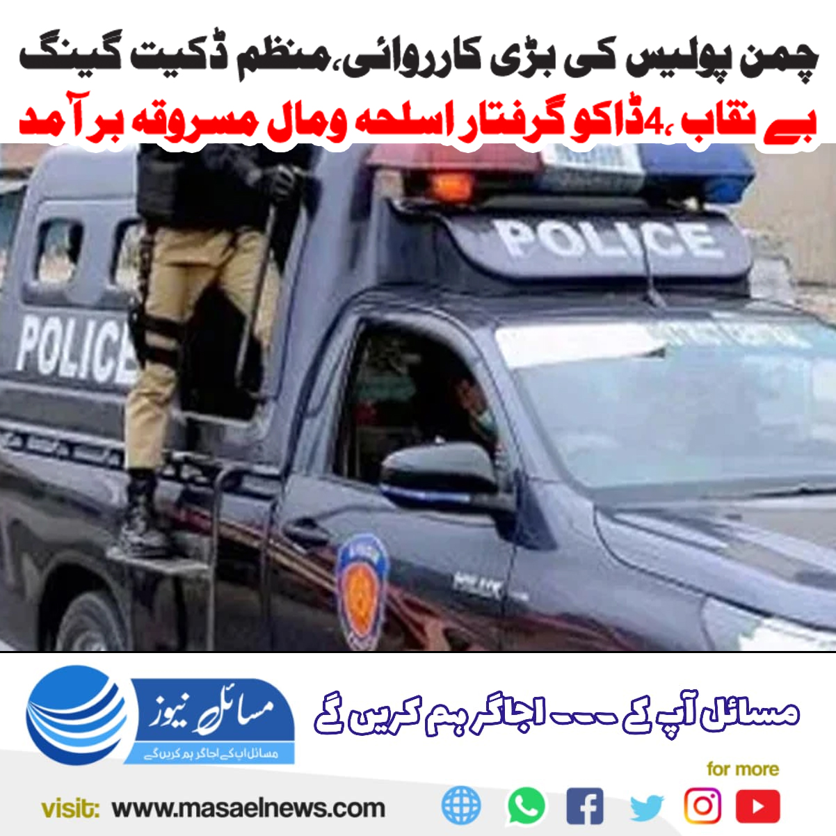 چمن پولیس کی بڑی کارروائی؛ منظم ڈکیت گینگ بے نقاب، 4 ڈاکو گرفتار، اسلحہ و مالِ مسروقہ برآمد