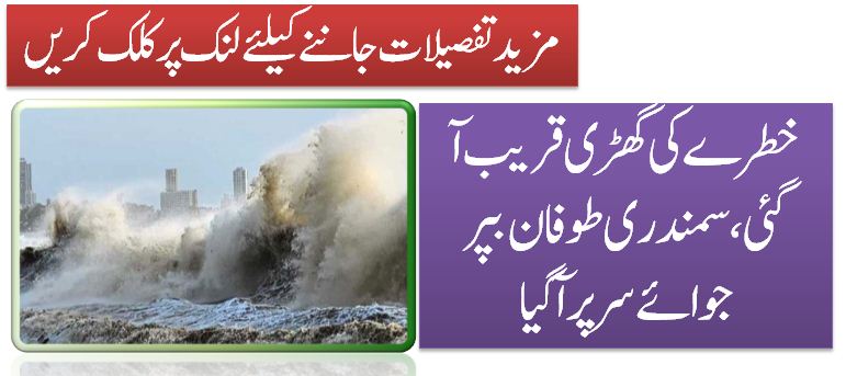 آج کراچی سمیت سندھ اور بلوچستان کے ساحلی علاقے تیز آندھی، سمندری طوفان اور سیلاب کی زد میں آ سکتے ہیں۔ سمندری طوفان ٹکرانے سے پہلے بدین، سجاول اور کیٹی بندر سے لوگوں کے انخلاء کی آخری کوششیں بھی جاری ہیں۔کبھی ہلکی، کبھی موسلا دھار بارش کا سلسلہ وقفے وقفے سے جاری ہے۔طوفان آج شام کیٹی بندر اور بھارتی گجرات سے گزرنے کا امکان ہے۔
