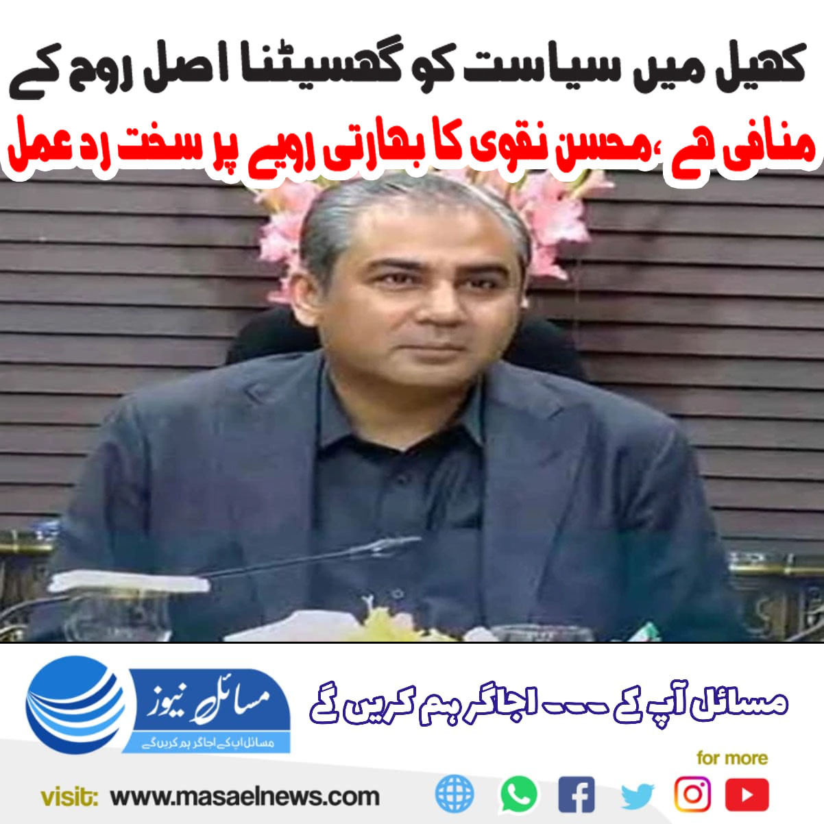 سماجی رابطے کی ویب سائٹ ’’ایکس‘‘ پر پیغام جاری کرتے ہوئے محسن نقوی نے لکھا کہ ’’کھیل میں سیاست کو گھسیٹنا اس کی اصل روح کے منافی اور افسوسناک ہے۔‘‘