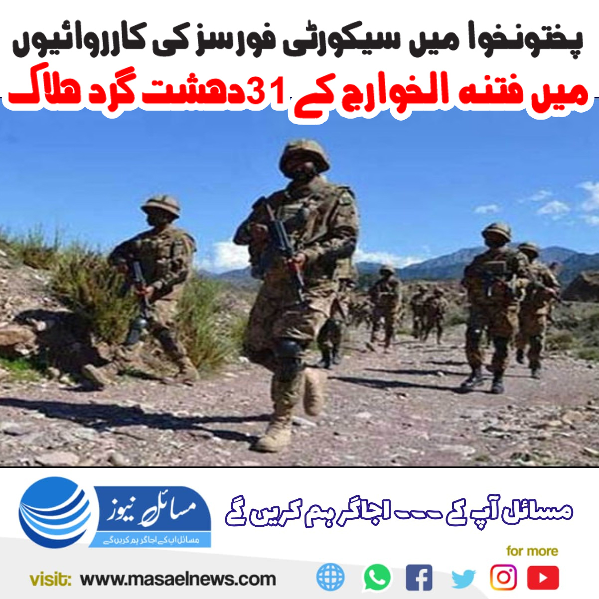 پاک فوج کے شعبہ تعلقات عامہ (آئی ایس پی آر) کے مطابق 13 اور 14 ستمبر کو خیبر پختونخوا میں سکیورٹی فورسز کی 2 مختلف کارروائیوں میں بھارت نواز دہشت گرد گروہ ’’فتنہ الخوارج‘‘ کے 31 دہشت گرد ہلاک کر دیے گئے۔