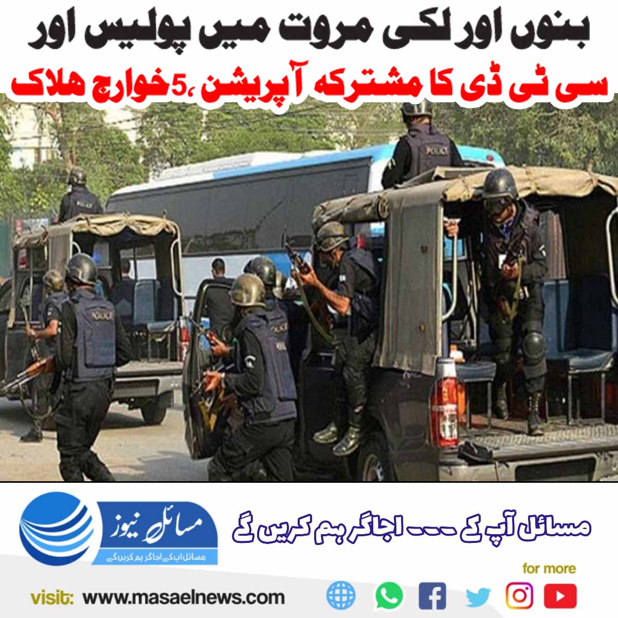 پشاور (مسائل نیوز) پولیس اور کاؤنٹر ٹیررازم ڈپارٹمنٹ ( سی ٹی ڈی ) نے بنوں اور لکی مروت میں مشترکہ آپریشن کرتے ہوئے 5 خوارج ہلاک کر دیے۔