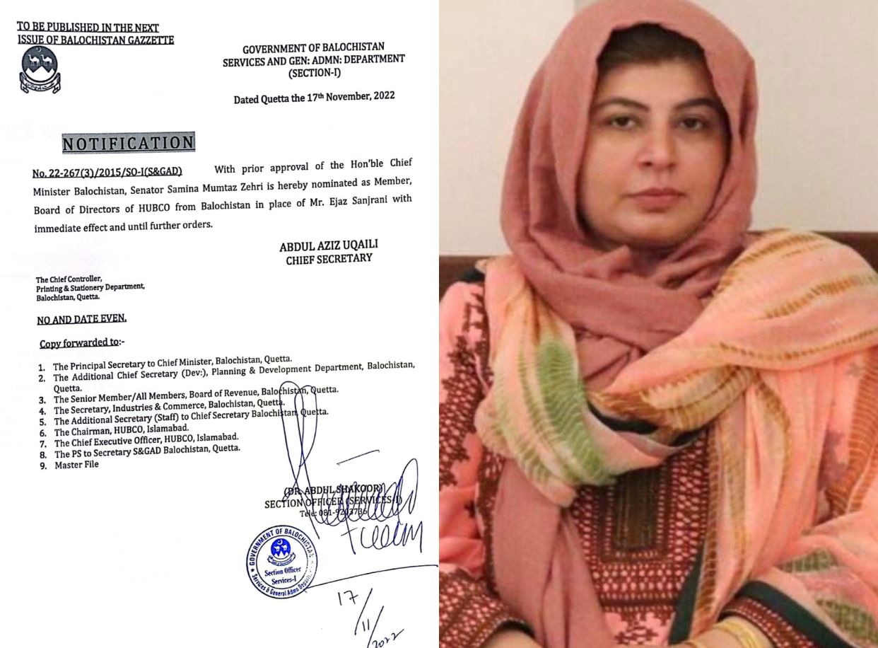 حبکو بورڈ آف ڈائریکٹرز میں اعجاز سنجرانی کی جگہ سینیٹر ثمینہ ممتاز زہری بورڈ آف ڈائریکٹر کے رکن ہونگی، نوٹیفکیشن جاری
