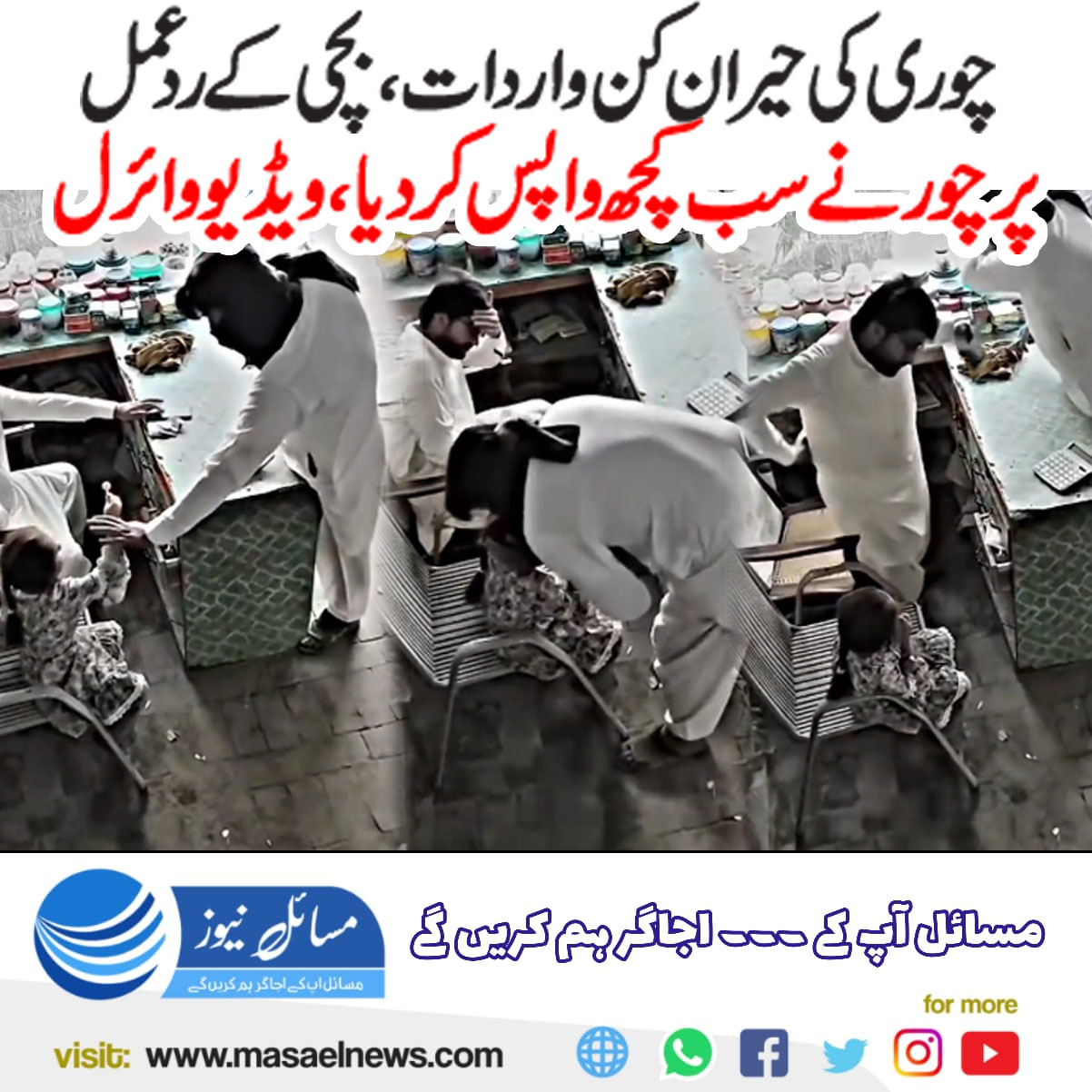 ویڈیو میں دیکھا جا سکتا ہے کہ دکان میں موجود چھوٹی بچی نے خوف کے باوجود ہاتھ میں پکڑی ہوئی کھانے کی چیز چور کو دے دی۔ بچی کے اس ردعمل نے چور کے دل پر اثر ڈالا اور اس نے فوری طور پر دکاندار کو اس کی ساری چیزیں واپس کر دیں۔