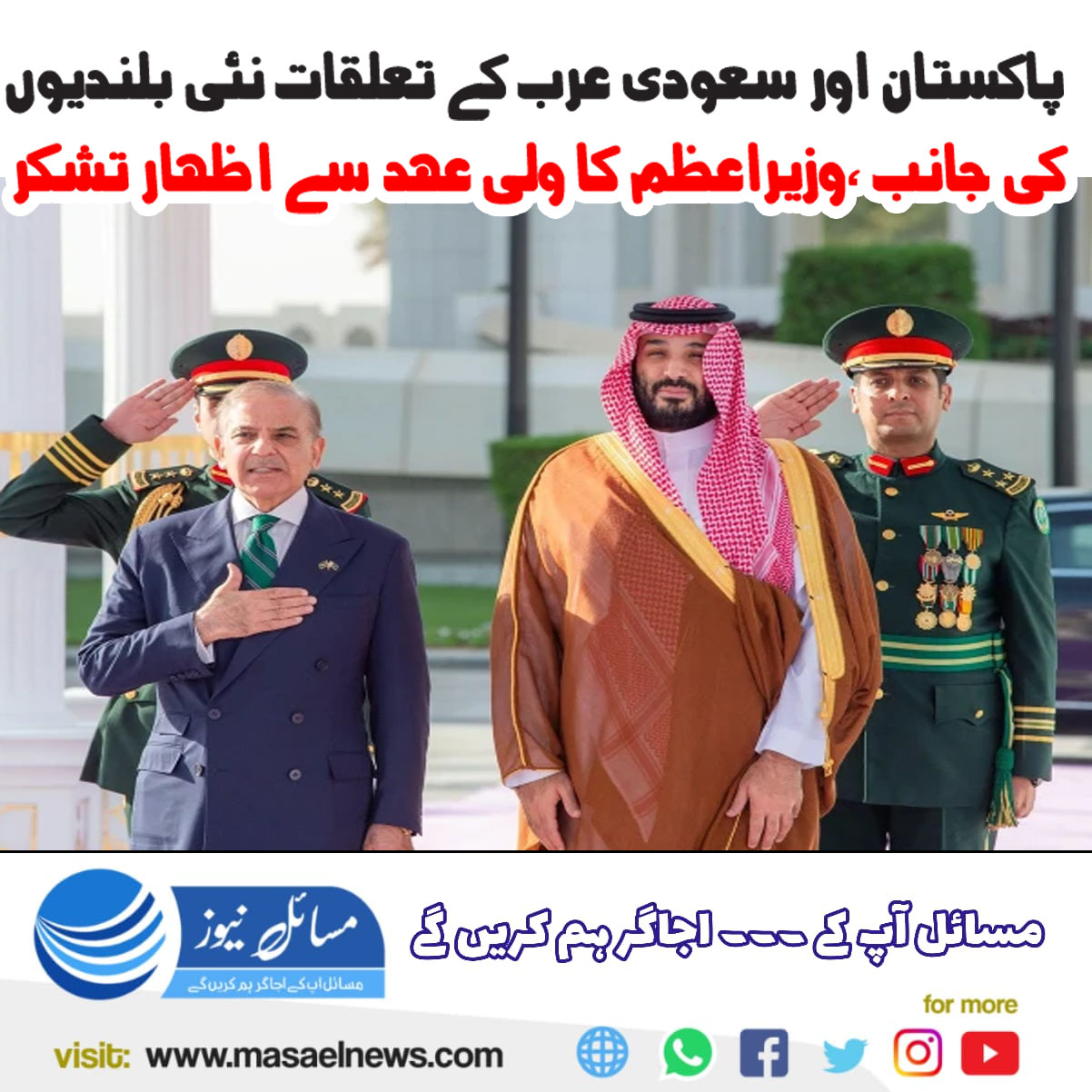 سعودی عرب (مسائل نیوز)وزیر اعظم شہباز شریف نے کہا ہے کہ میں اپنے عزیز بھائی شہزادہ محمد بن سلمان، ولی عہد اور سعودی عرب کے وزیر اعظم کی طرف سے ریاض کے سرکاری دورے پر دل کی گہرائیوں کو چھونے والے استقبال سے بہت متاثر ہوا۔